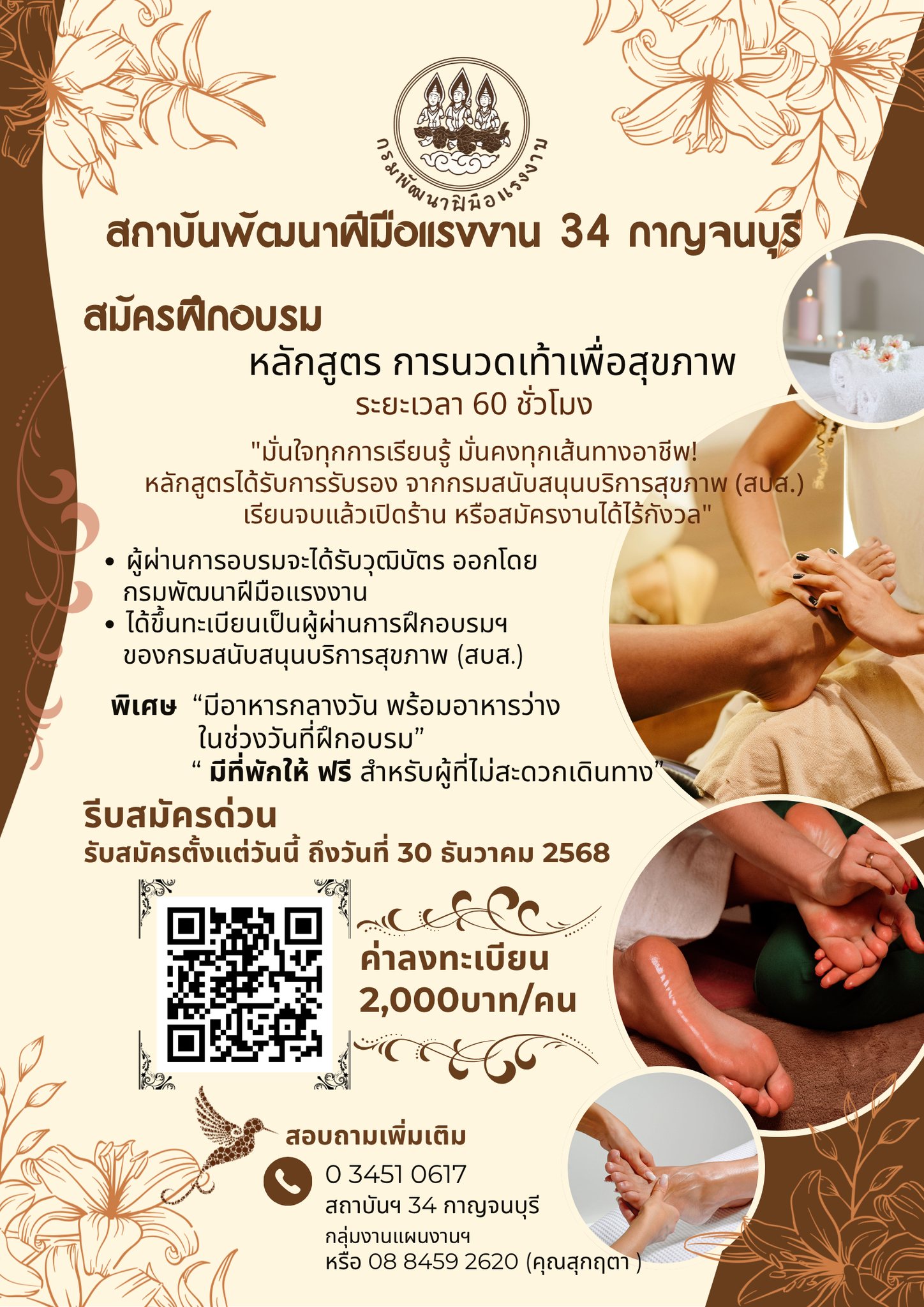 ??????สถาบันพัฒนาฝีมือแรงงาน 34 กาญจนบุรี รับสมัครฝึกอบรม หลักสูตรการนวดเท้าเพื่อสุขภาพ ระยะเวลา 60 ชั่วโมง