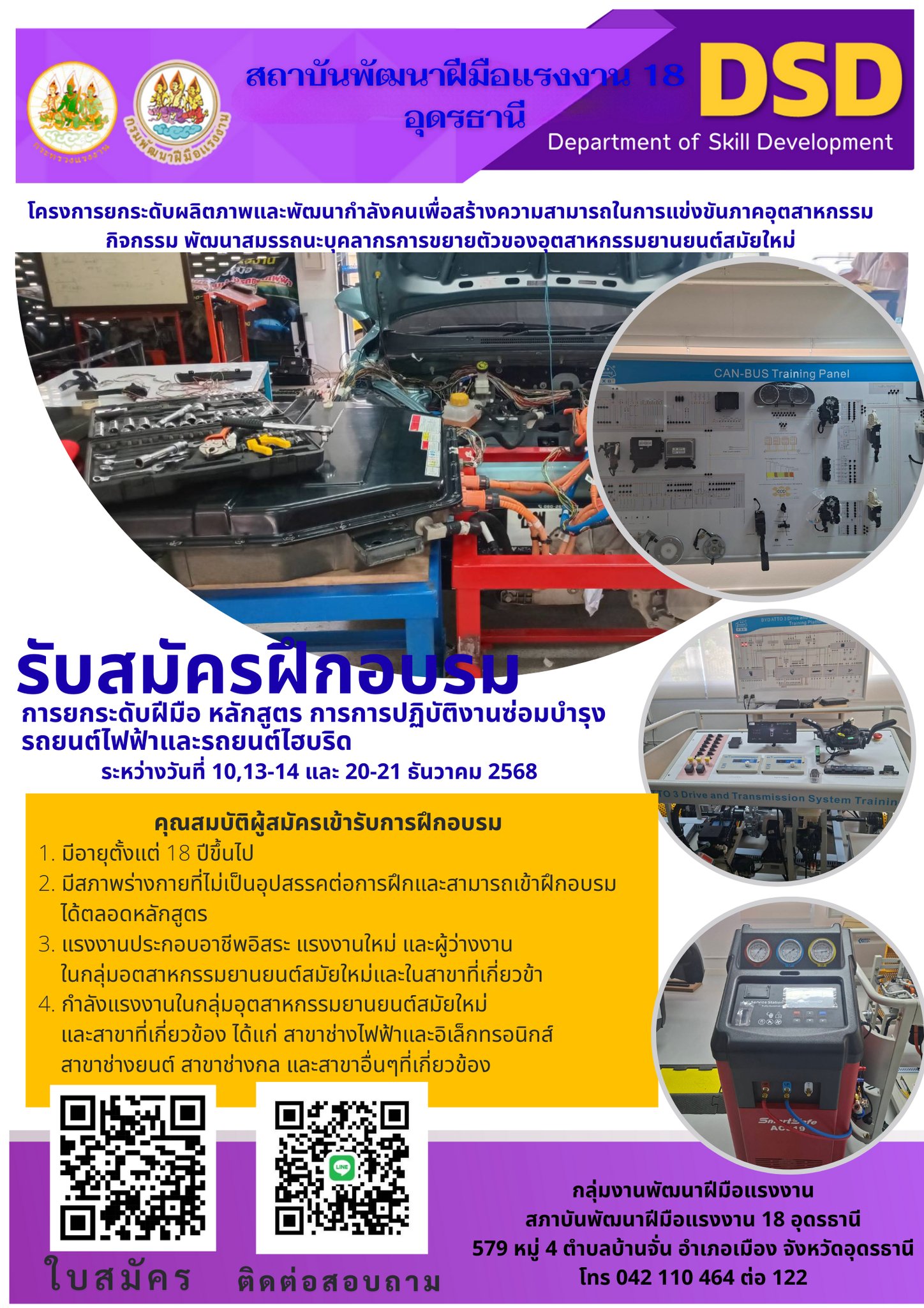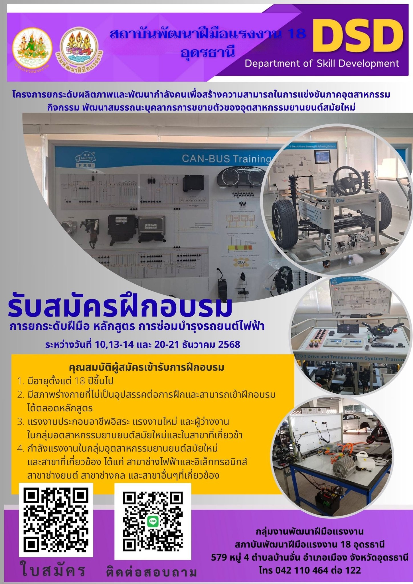 สถาบันพัฒนาฝีมือแรงงาน 18 อุดรธานี เปิดรับสมัครฝึกอบรม "หลักสูตรการซ่อมบำรุงรถยนต์ไฟฟ้า"