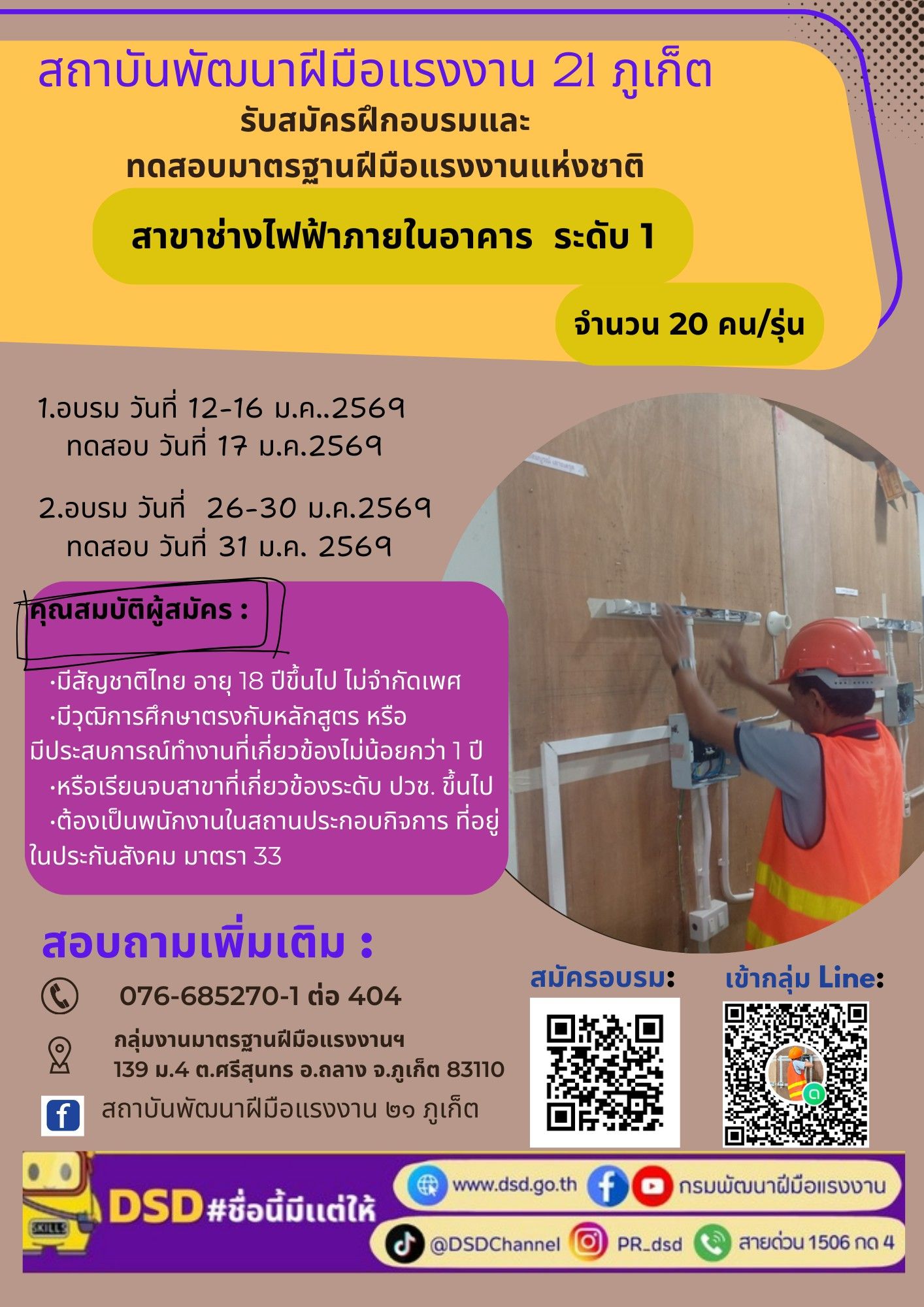 ???? สถาบันพัฒนาฝีมือแรงงาน 21 ภูเก็ต เปิดรับสมัครฝึกอบรมและทดสอบมาตรฐานฝีมือแรงงานแห่งชาติ สาขาช่างไฟฟ้าภายในอาคาร ระดับ 1???????