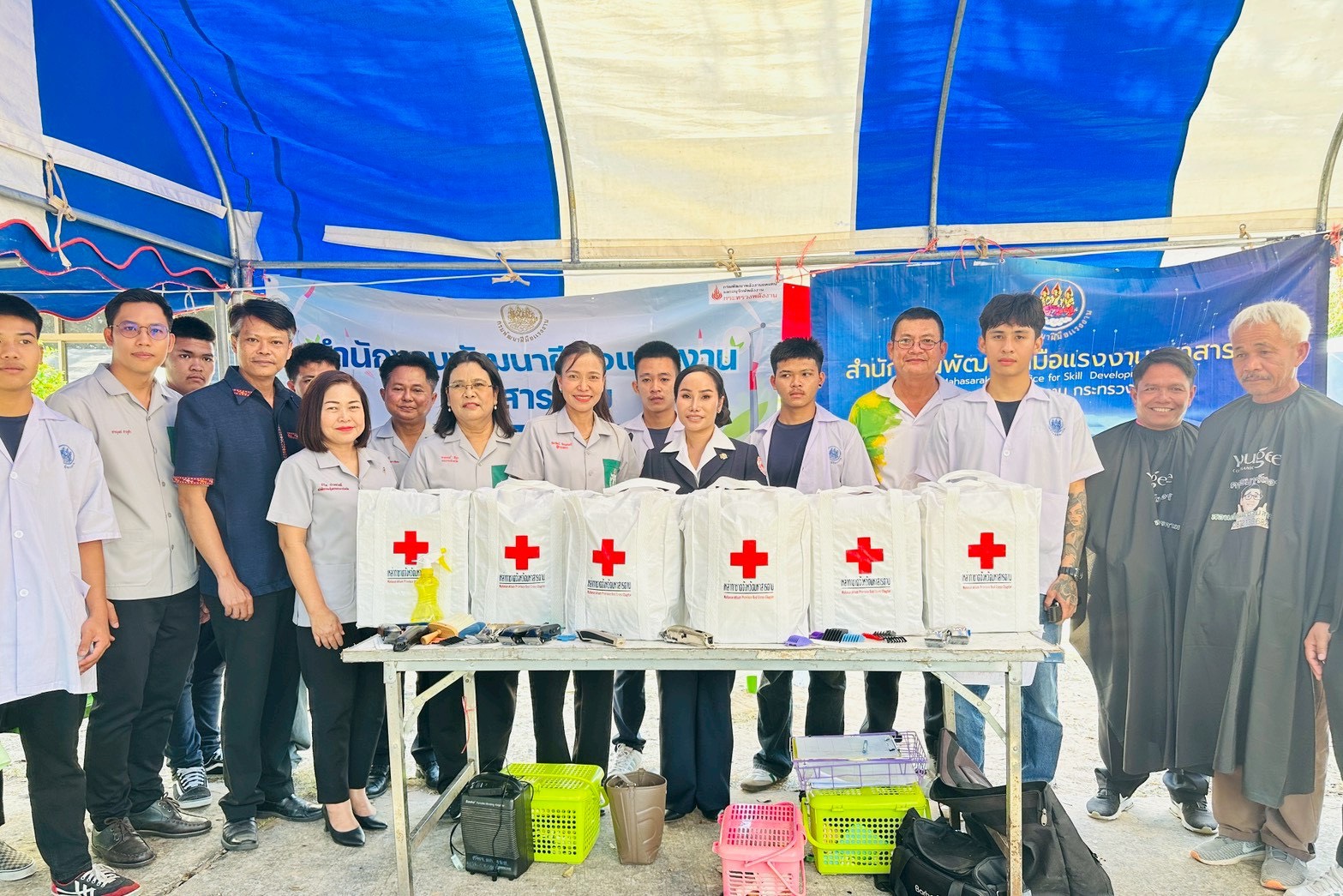 นายกเหล่ากาชาดจังหวัดมหาสารคาม ในโอกาสลงพื้นที่เยี่ยมให้กำลังใจและมอบถุงยังชีพแก่ผู้เข้ารับการฝึกอบรมหลักสูตรช่างแต่งผม