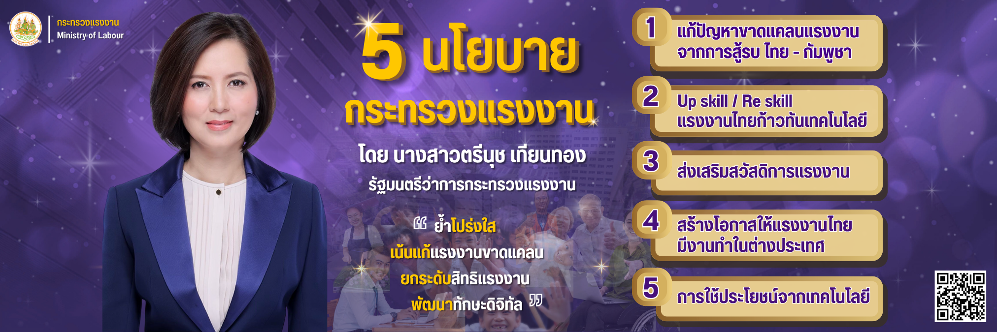 5 นโยบายกระทรวงแรงงาน โดย นางสาวตรีนุช เทียนทอง รัฐมนตรีว่าการกระทรวงแรงงาน ?????“ย้ำโปร่งใส เน้นแก้แรงงานขาดแคลน ยกระดับสิทธิแรงงาน พัฒนาทักษะดิจิทัล”