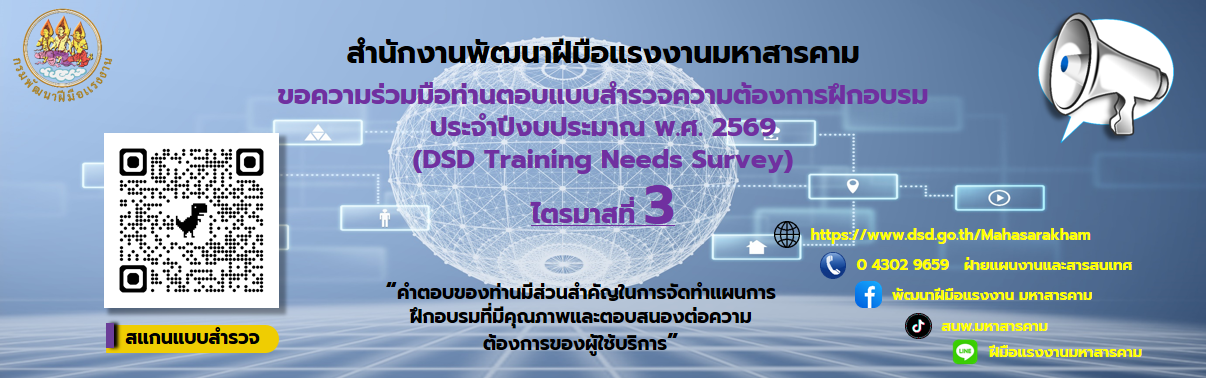 สำนักงานพัฒนาฝีมือแรงงานมหาสารคาม ประชาสัมพันธ์แบบสำรวจความต้องการฝึกอบรม ประจำปีงบประมาณ พ.ศ. 2569 ไตรมาส 1