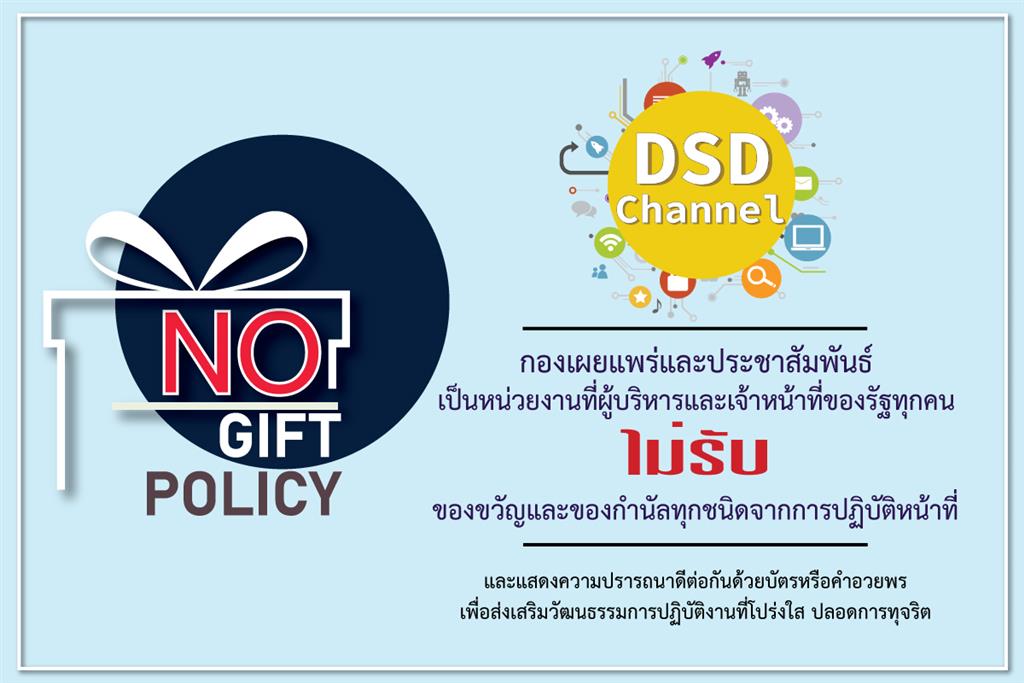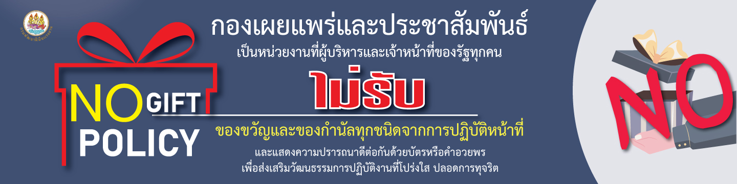 กองเผยแพร่และประชาสัมพันธ์ ร่วมสร้างวัฒนธรรม No Gift Policy ไม่รับของขวัญและของกำนัลทุกชนิดจากการปฏิบัติหน้าที่ และแสดงความปรารถนาดีต่อกันด้วยบัตรหรือคำอวยพร เพื่อส่งเสริมวัฒนธรรมการปฏิบัติงานที่โปร่งใส ปลอดการทุจริต