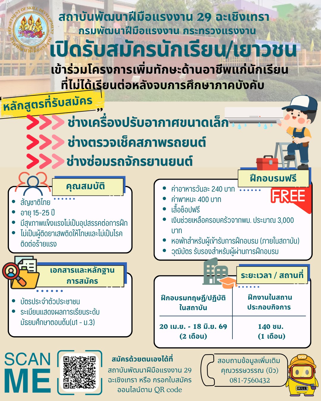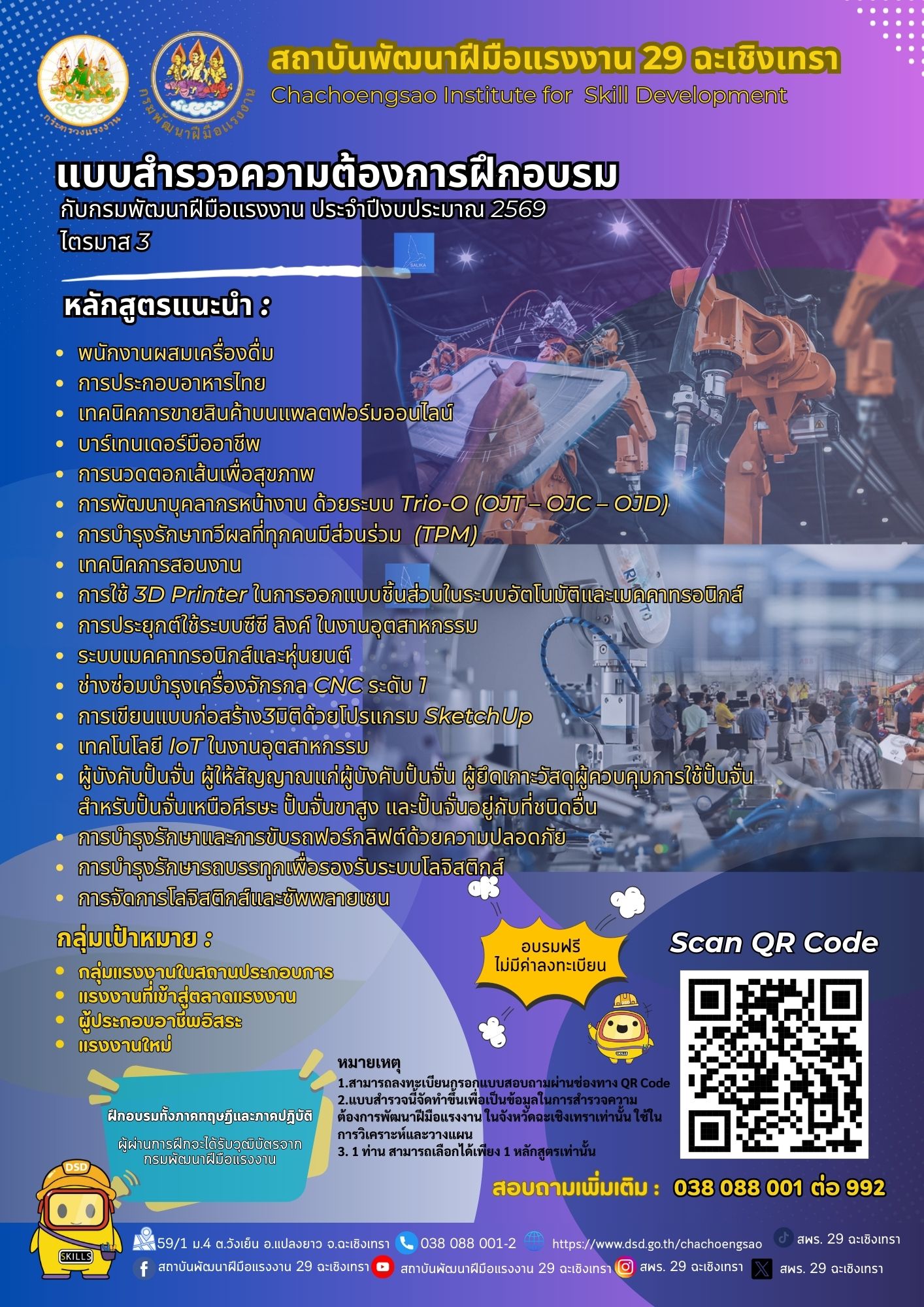 ประกาศสถาบันพัฒนาฝีมือแรงาน 29 ฉะเชิงเทรา เรื่อง ประกวดราคาจ้างเหมาบริการทำความสะอาดอาคาร จ้างเหมาบริการดูแลบำรุงรักษาต้นไม้ สนามหญ้าและสวนหย่อม และจ้างเหมาบริการพนักงานขับรถยนต์ ประจำปีงบประมาณ 2569 ด้วยวิธีประกวดราคาอิเล็กทรอนิกส์ (e-bidding)