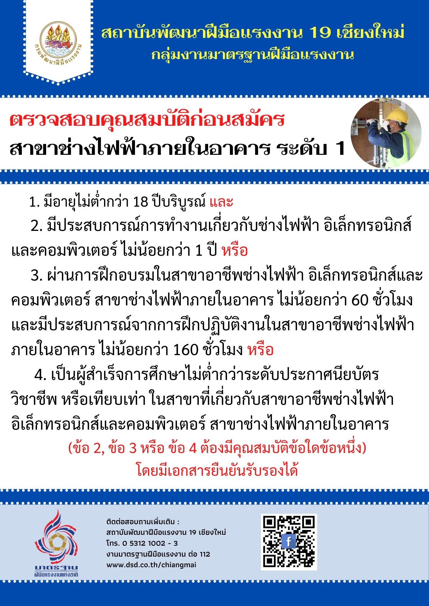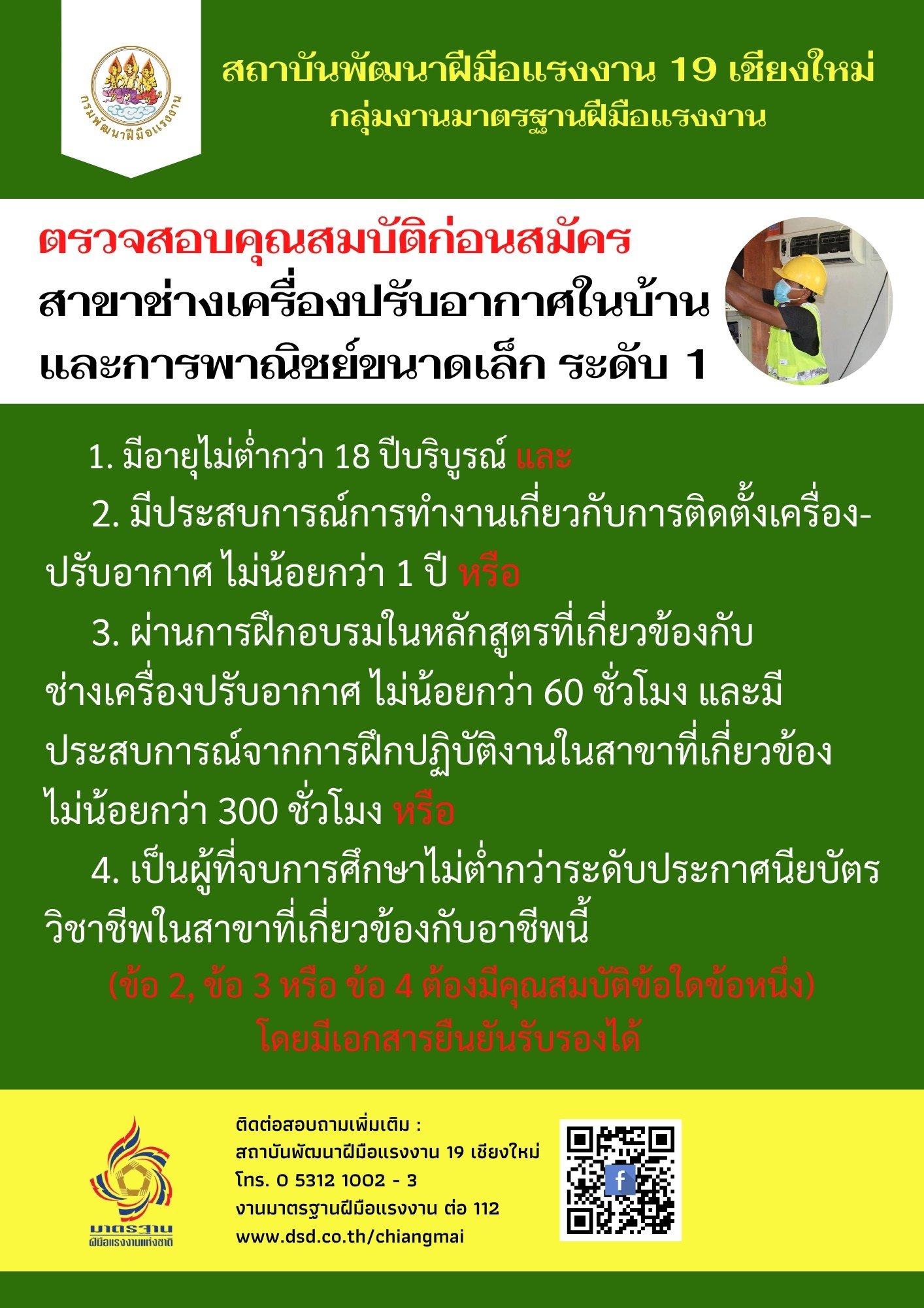 คุณสมบัติ ผู้เข้าทดสอบมาตรฐานฝีมือแรงงานแห่งชาติ (ช่างอุตสาหกรรม ได้แก่ ช่างไฟฟ้า ช่างเครื่องปรับอากาศ)