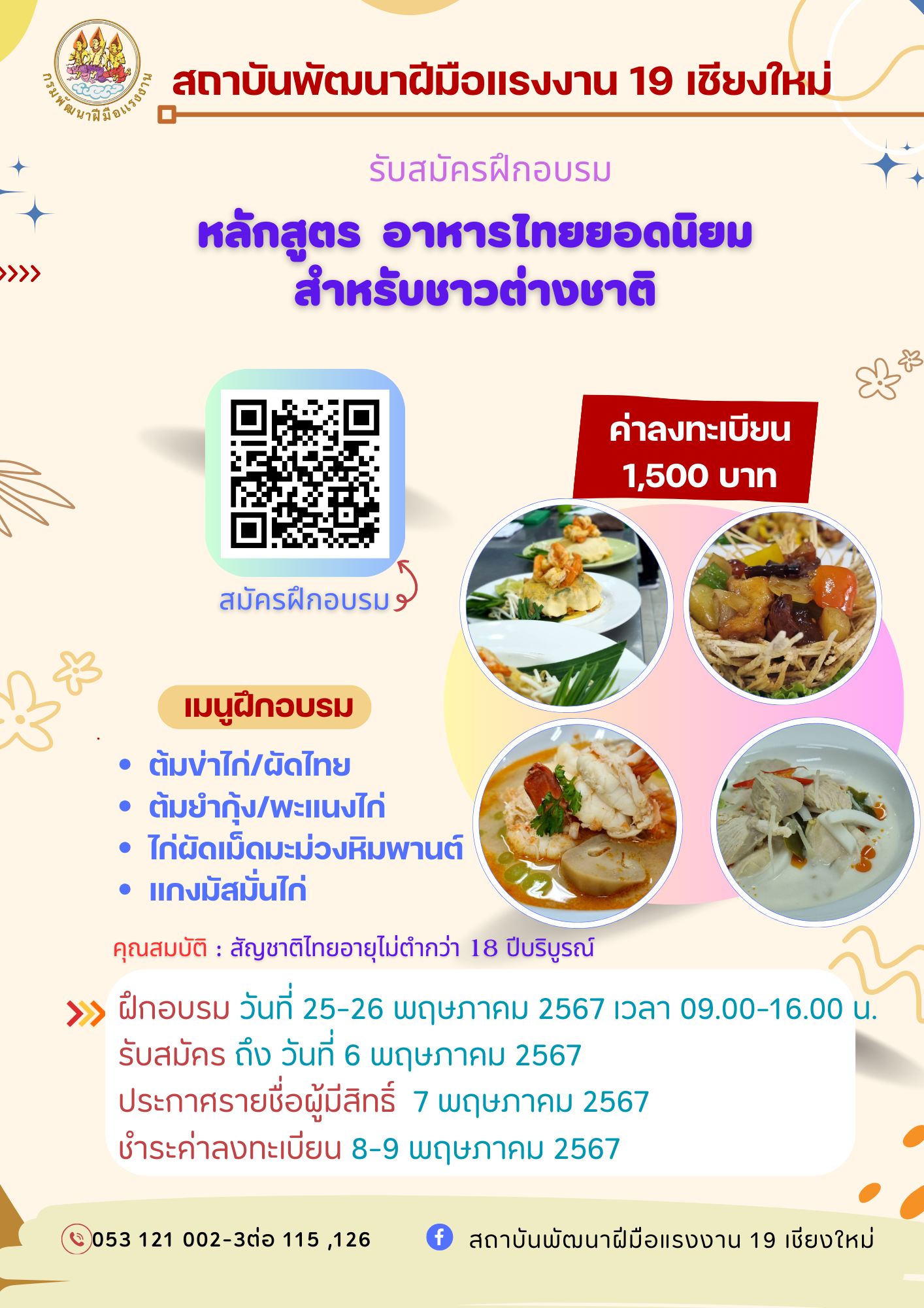 สถาบันพัฒนาฝีมือแรงงาน 19 เชียงใหม่ รับสมัครการฝึกยกระดับฝีมือ หลักสูตร อาหารไทยยอดนิยมสำหรับชาวต่างชาติ 12 ชั่วโมง