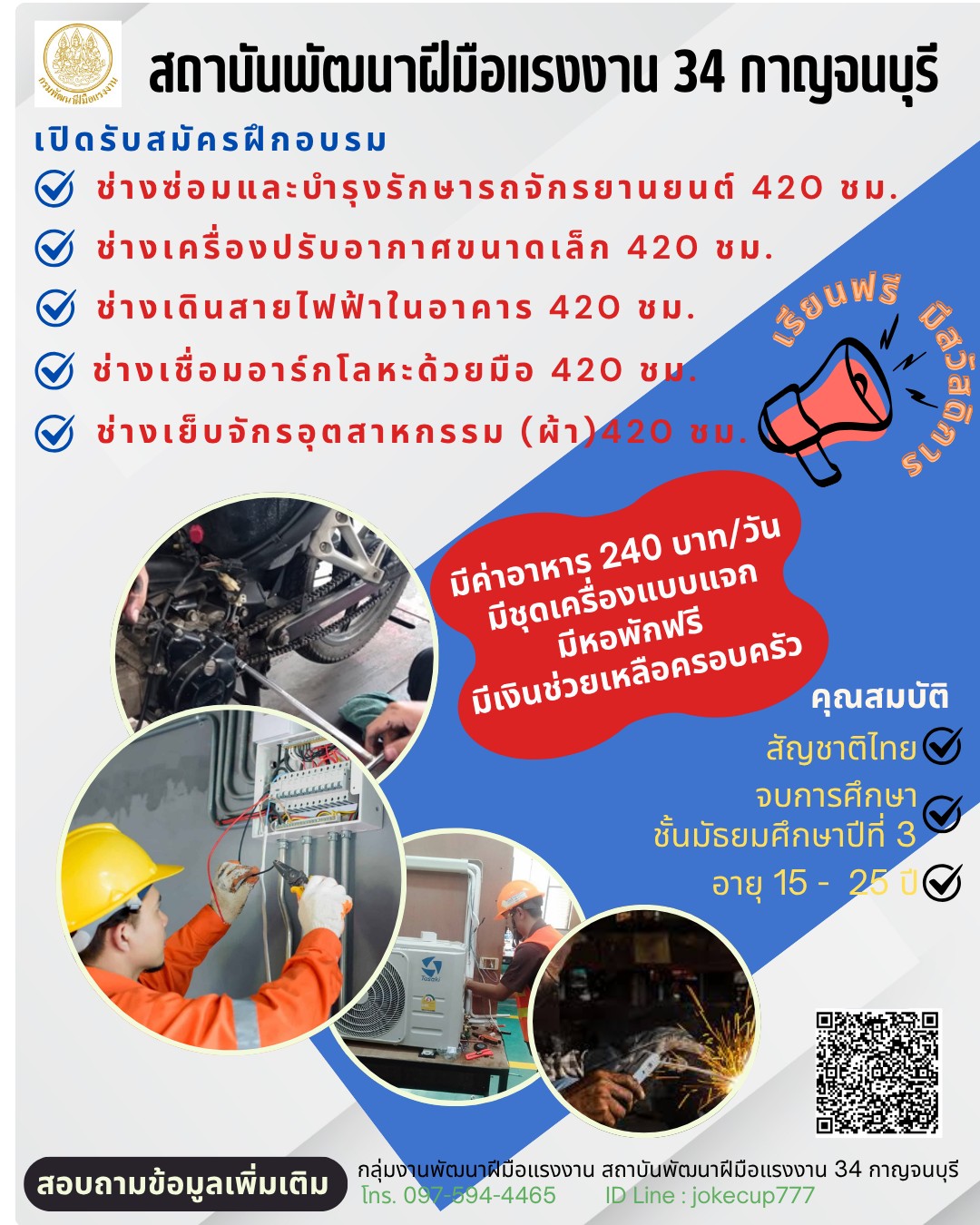 สถาบันพัฒนาฝีมือแรงงาน 34 กาญจนบุรี ประกาศรับสมัครฝึกอบรม หลักสูตรเตรียมเข้าทำงาน