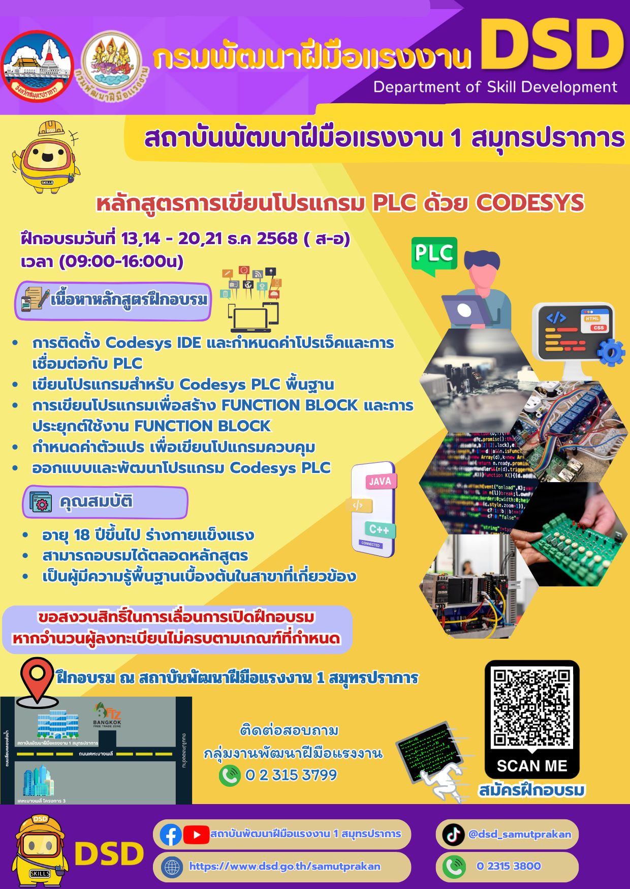 สถาบันพัฒนาฝีมือแรงงาน 1 สมุทรปราการ เปิดรับสมัครฝึกอบรมหลักสูตรสุดฮิต! การเขียนโปรแกรม PLC ด้วย CODESYS