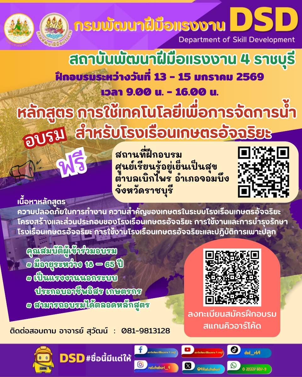 สถาบันพัฒนาฝีมือแรงงาน 4 ราชบุรี เปิดหลักสูตร “การใช้เทคโนโลยีเพื่อการจัดการน้ำ สำหรับโรงเรือนเกษตรอัจฉริยะ"
