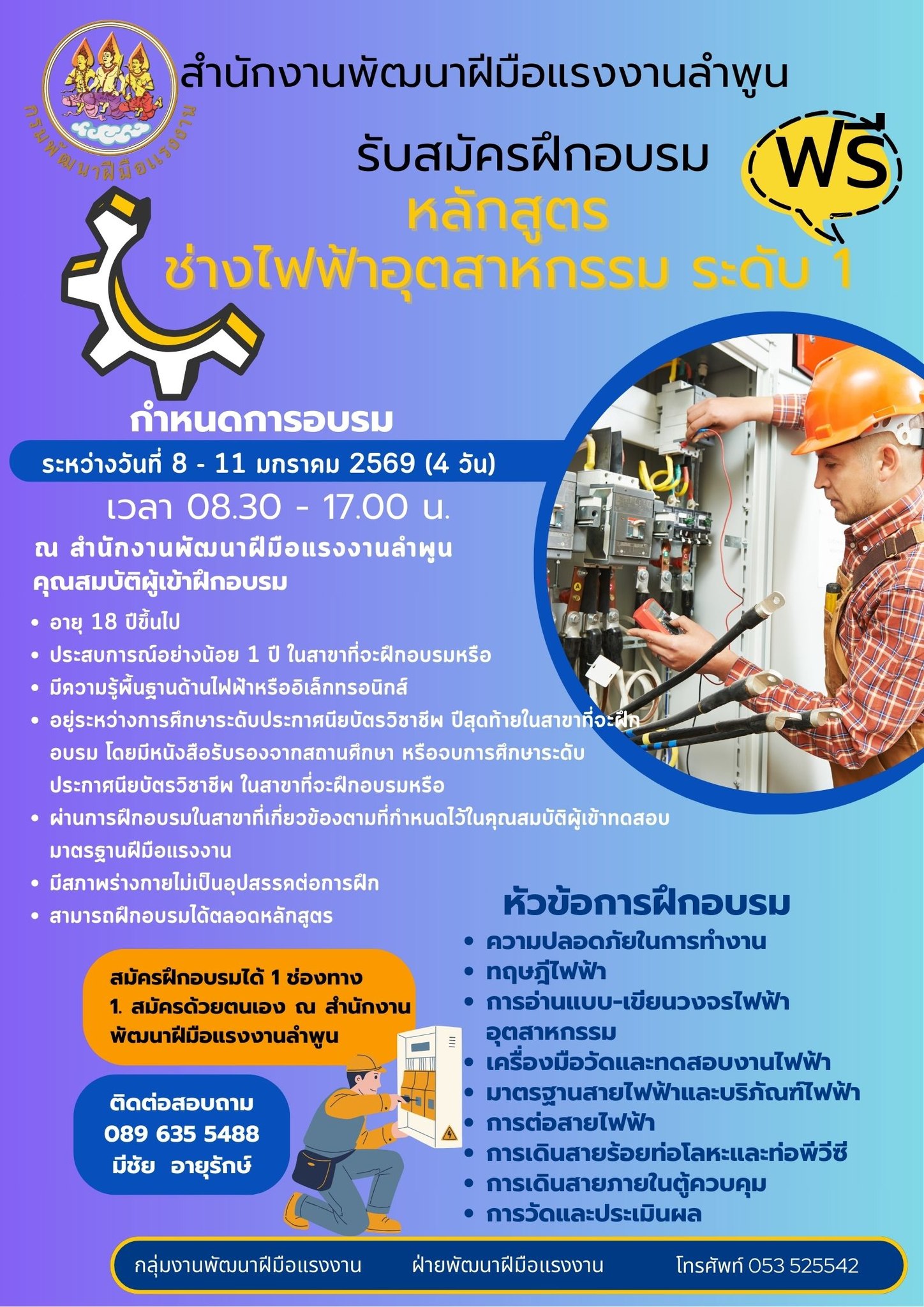 สำนักงานพัฒนาฝีมือแรงงานลำพูน รับสมัครผู้เข้ารับฝึกอบรม หลักสูตร สาขาช่างไฟฟ้าอุตสาหกรรม ระดับ 1 ฟรี