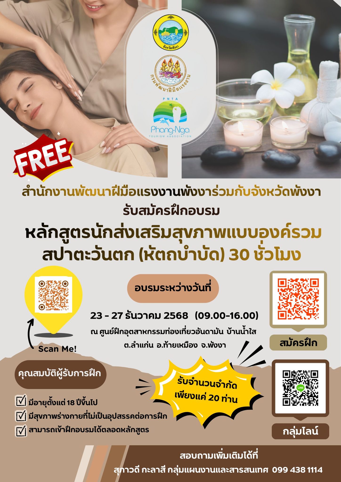สำนักงานพัฒนาฝีมือแรงงานพังงา เปิดรับสมัครฝึกอบรม “หลักสูตรนักส่งเสริมสุขภาพแบบองค์รวมสปาตะวันตก (หัตถบำบัด)”