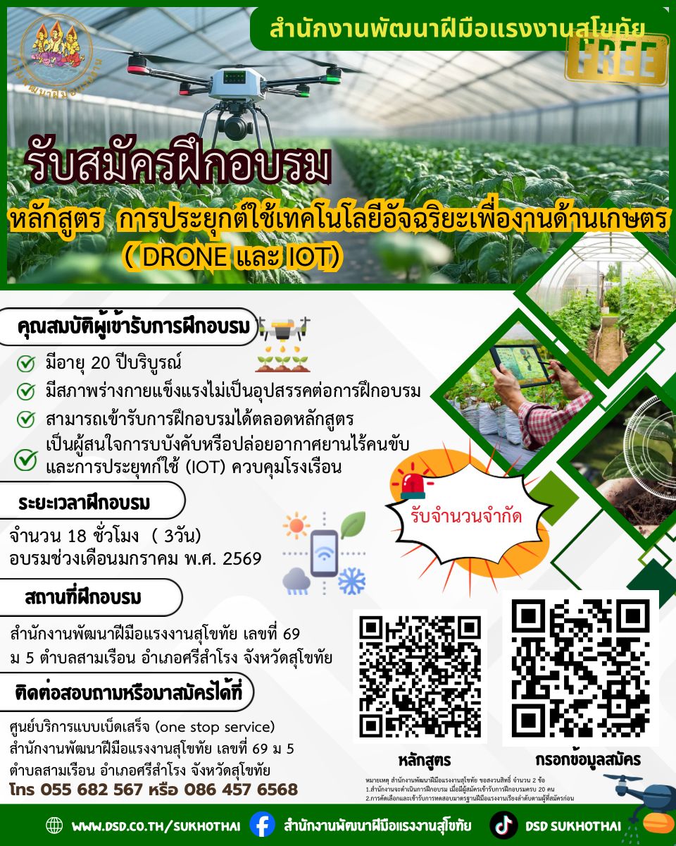 สำนักงานพัฒนาฝีมือแรงงานสุโขทัย เปิดรับสมัครฝึกอบรม หลักสูตรการประยุกต์ใช้เทคโนโลยีอัจฉริยะเพื่องานเกษตร (Drone และ IoT)