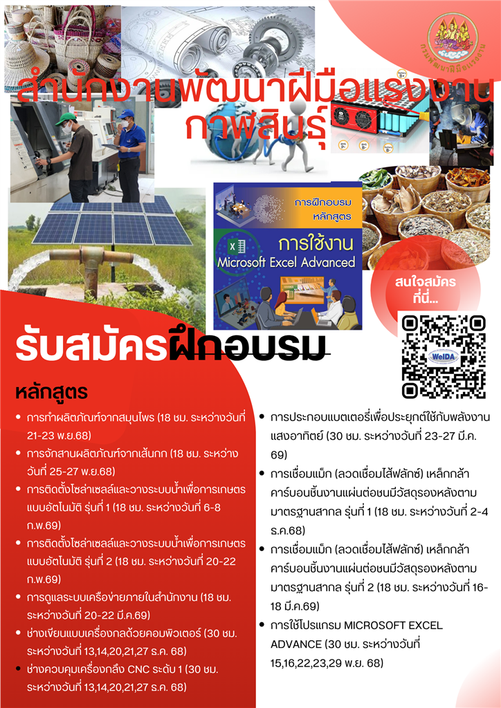 สำนักงานพัฒนาฝีมือแรงงานกาฬสินธุ์ กำหนดเปิดรับสมัครแรงงานที่จะเข้าสู่การทำงานในตลาดแรงงาน แรงงานใหม่ ผู้ว่างงาน แรงงานในสถานประกอบกิจการ เข้ารับการฝึกอบรมฝีมือแรงงาน เพื่อพัฒนาสมรรถนะและทักษะใหม่ แก่แรงงานให้สอดคล้องกับความต้องการของตลาดแรงงานสมัยใหม่ และสถานการณ์ที่เปลี่ยนแปลงตามอุตสาหกรรมเป้าหมาย