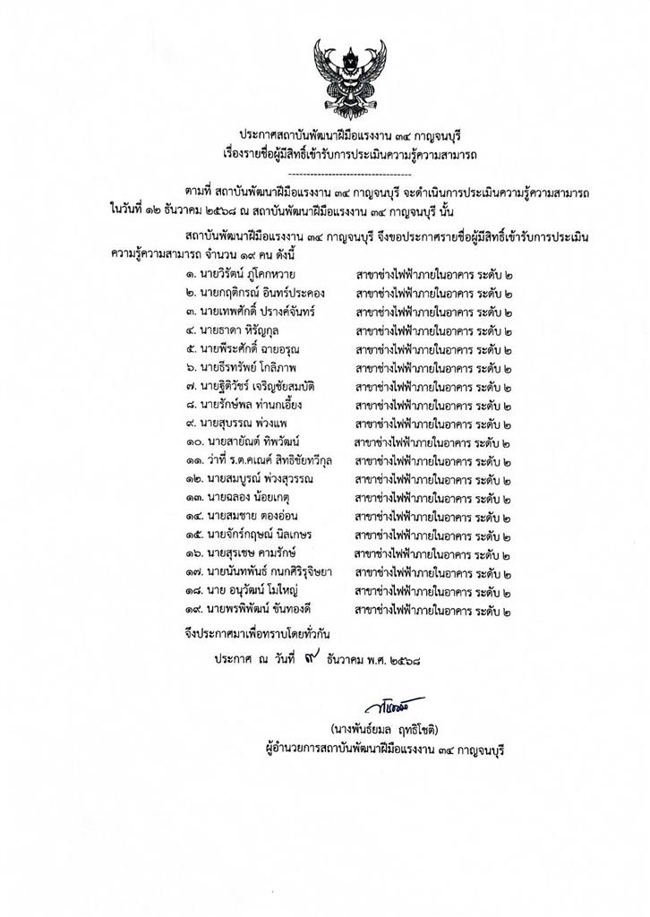 รายชื่อผู้มีสิทธิ์เข้ารับการประเมินความรู้ความสามารถ สาขาช่างไฟฟ้าภายในอาคาร ระดับ 2