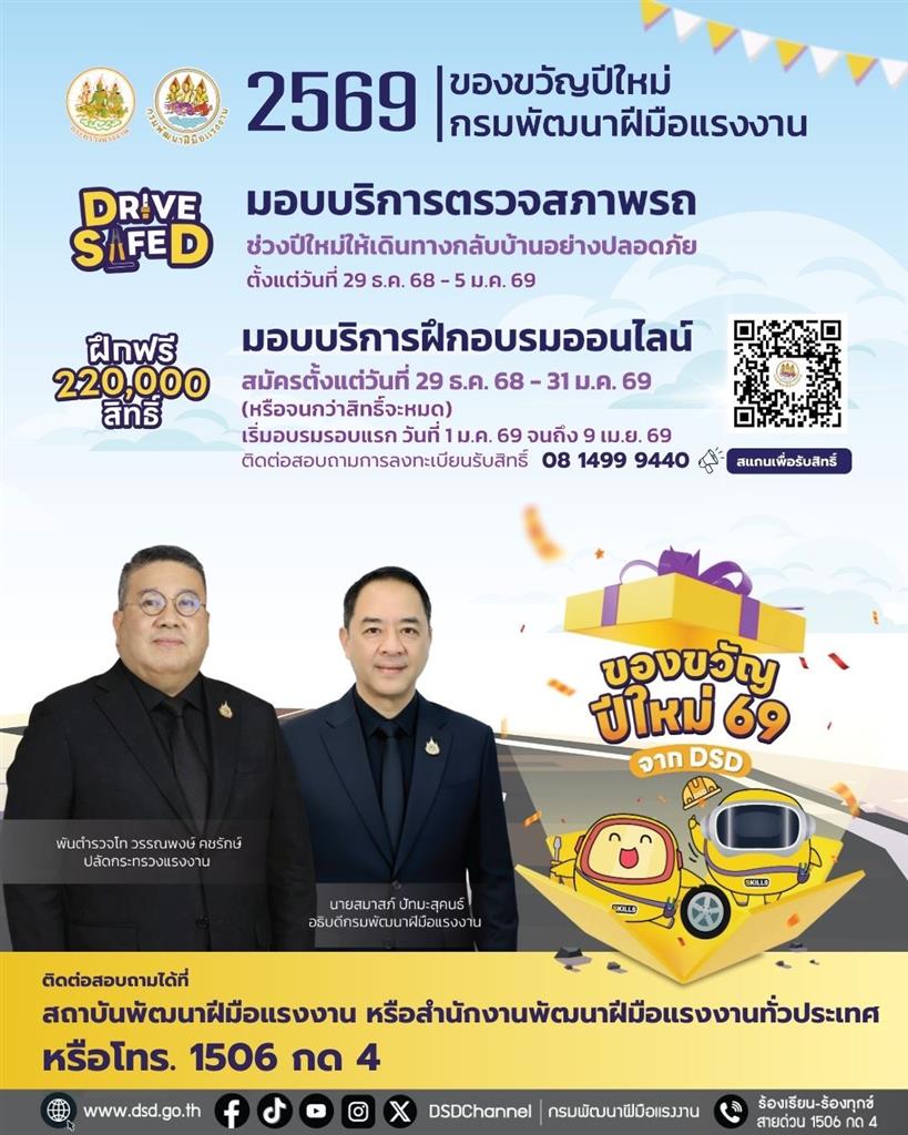 ขอเชิญรับชมการถ่ายทอดสดพิธีเปิดตัวของขวัญปีใหม่จากกรมพัฒนาฝีมือแรงงาน และ โครงการ “DRIVE SAFE D เช็คชัวร์ ก่อนเดินทาง”