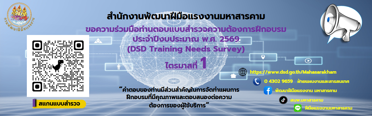 สำนักงานพัฒนาฝีมือแรงงานมหาสารคาม ประชาสัมพันธ์แบบสำรวจความต้องการฝึกอบรม ประจำปีงบประมาณ พ.ศ. 2569 ไตรมาส 1