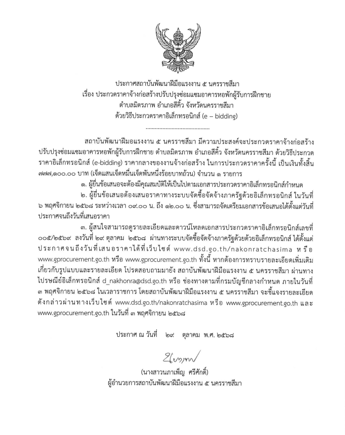 เรื่อง ประกวดราคาจ้างก่อสร้างปรับปรุงซ่อมแชมอาคารหอพักผู้รับการฝึกชาย ตำบลมิตรภาพ อำเภอสีคิ้ว จังหวัดนครราชสีมา ด้วยวิธีประกวดราคาอิเล็กทรอนิกส์ (e - bidding)