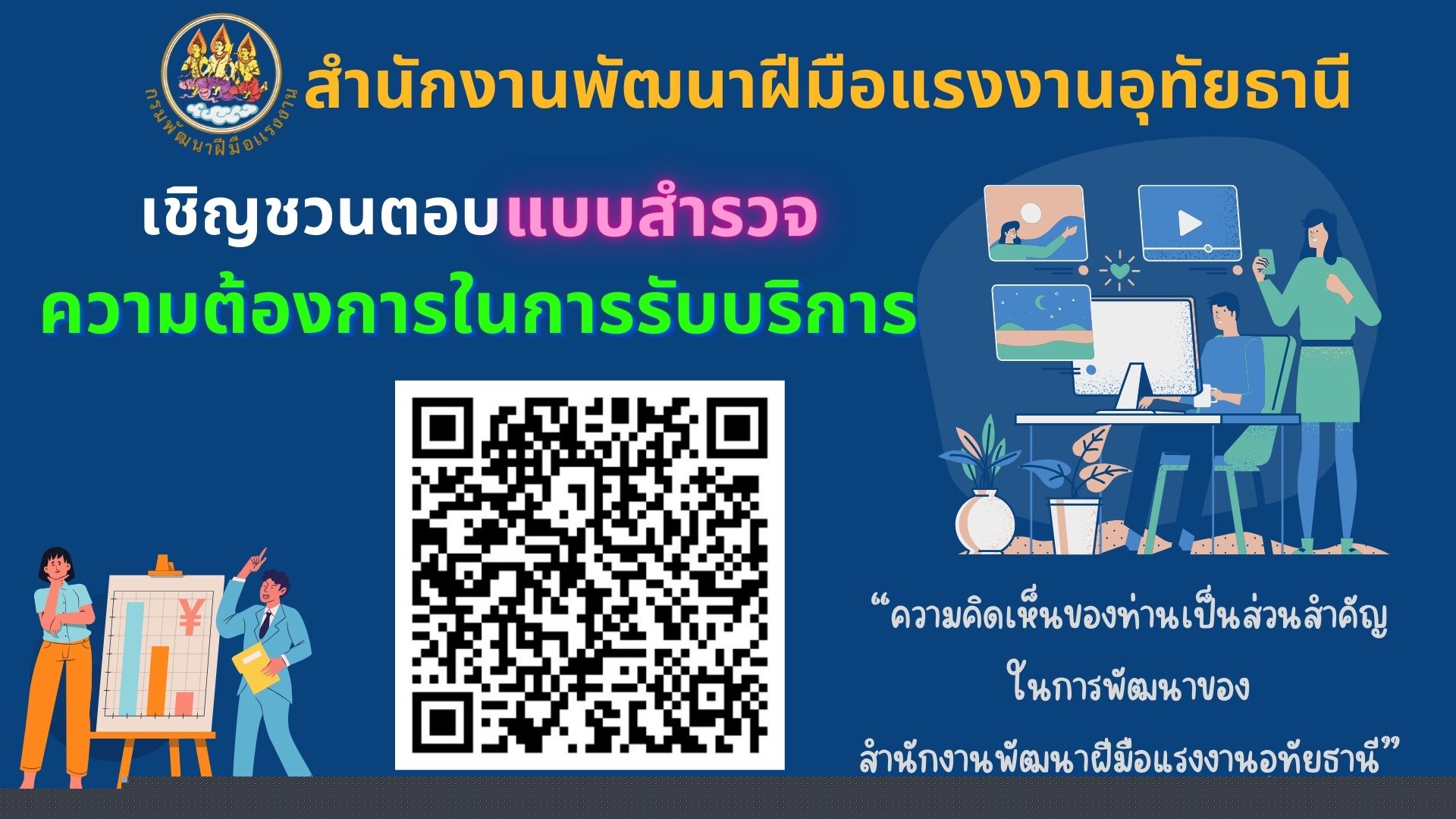 เชิญชวนตอบแบบสำรวจความต้องการในการรับบริการ ของสำนักงานพัฒนาฝีมือแรงงานอุทัยธานี  https://docs.google.com/forms/d/e/1FAIpQLSc8gfhZBgxNoTxJEYm6SDah7FKBeIRy6wGKYV9w-L5qWsSWUQ/viewform