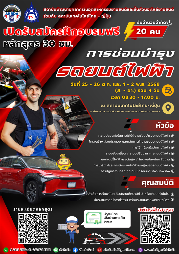 สถาบันพัฒนาบุคลากรในอุตสาหกรรมยานยนต์และชิ้นส่วนอะไหล่ยานยนต์ (AHRDA) ร่วมกับสถาบันเทคโนโลยีไทย - ญี่ปุ่น (TNI) เปิดรับสมัครฝึกอบรมฟรี