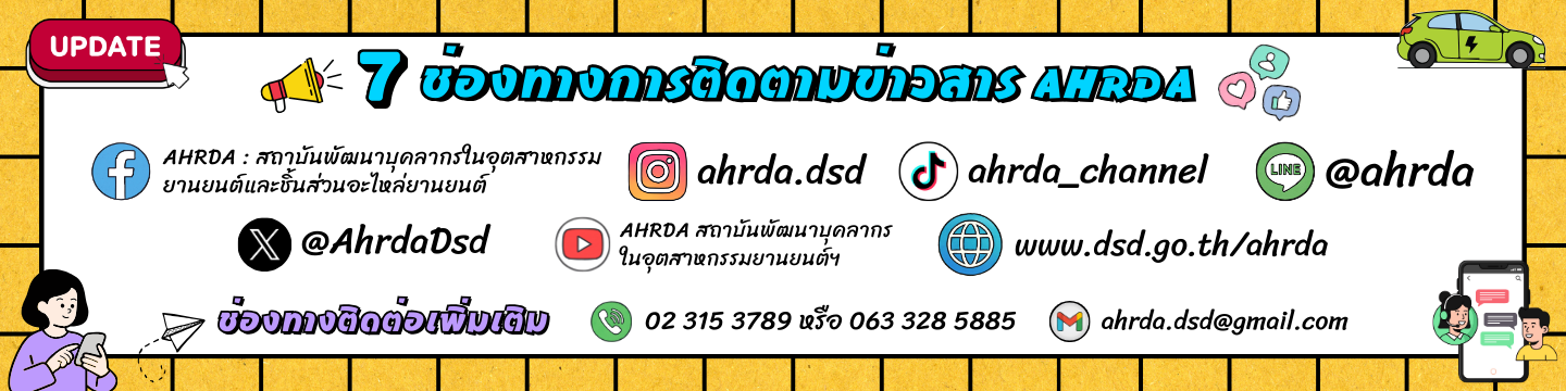 เพื่อรับทราบข่าวประชาสัมพันธ์การรับสมัครฝึกอบรมและการดำเนินงานของสถาบัน AHRDA โดยให้ทุกท่านคลิกที่ตัวอักษรเพื่อเข้าสู่โปรไฟล์ของแต่ละแพลตฟอร์มแล้วกด ติดตาม หรือ Follow ตามลิงก์ด้านล่างต่อไปนี้