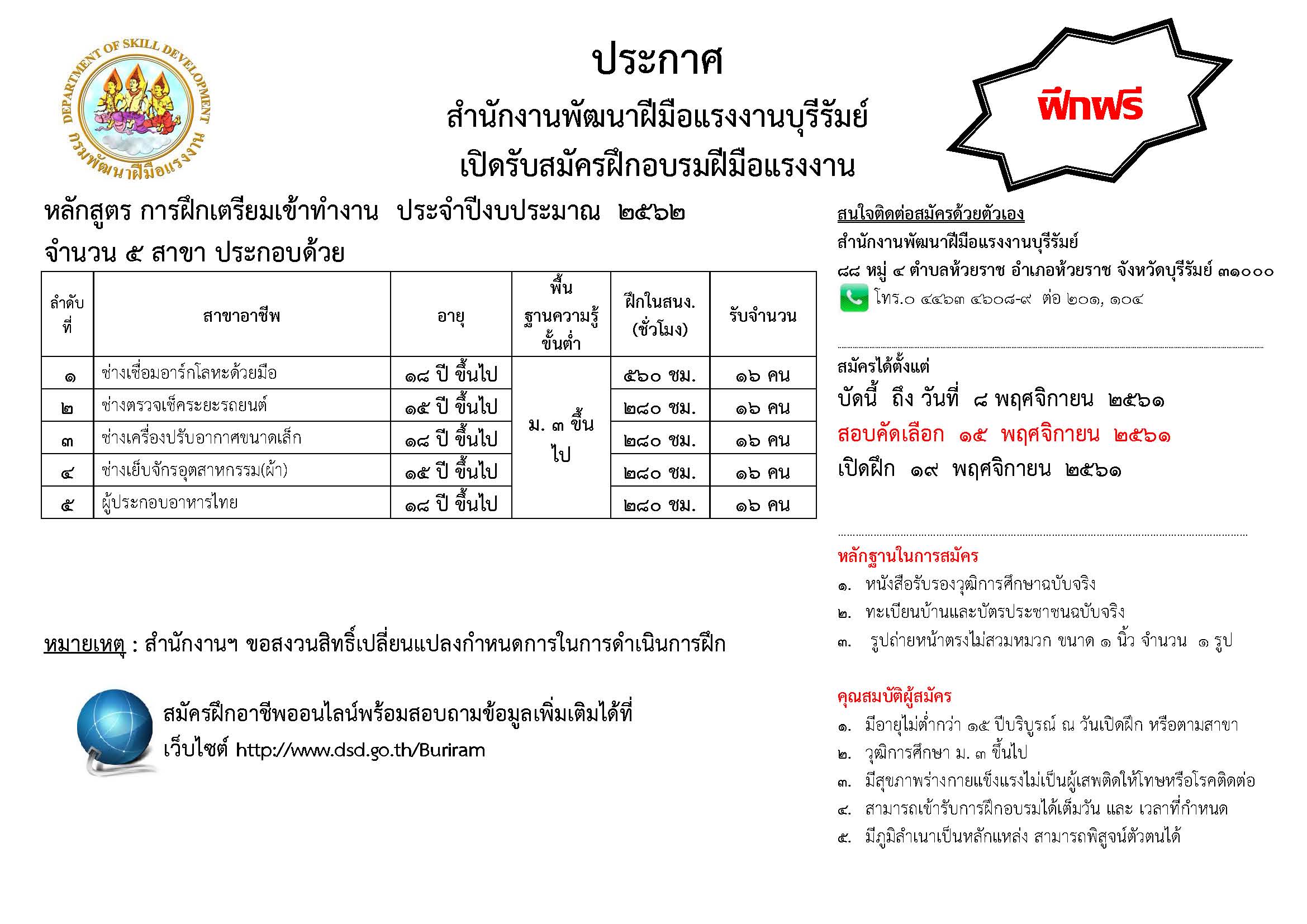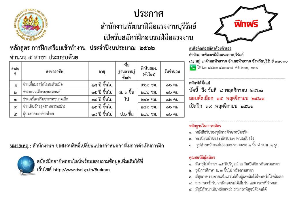 เปิดรับสมัครฝึกอบรมฝีมือแรงงาน