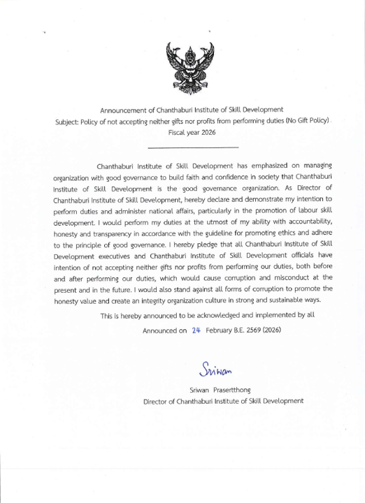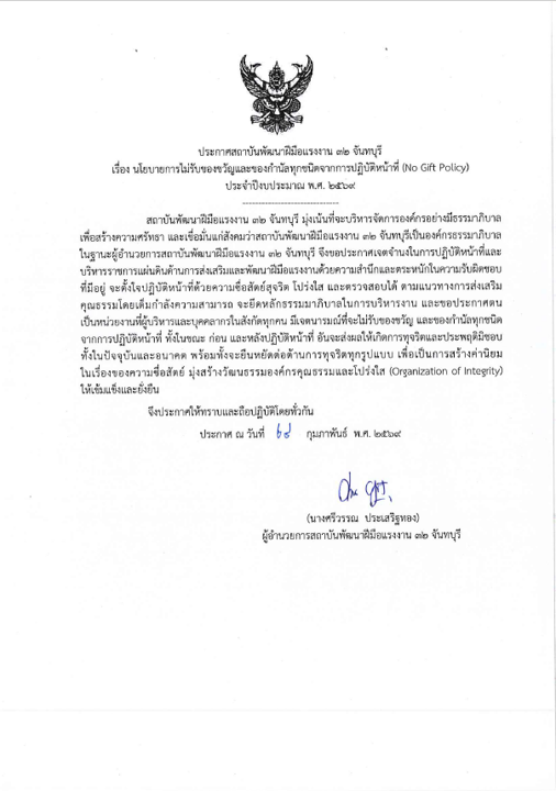 กรมพัฒนาฝีมือแรงงาน เป็นหน่วยงานที่ผู้บริหารและเจ้าหน้าที่รัฐทุกคน ไม่รับของขวัญหรือของกำนัลทุกชนิดจากการปฏิบัติหน้าที่