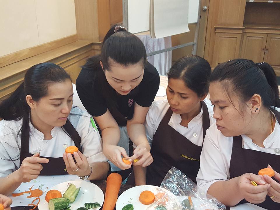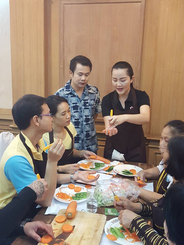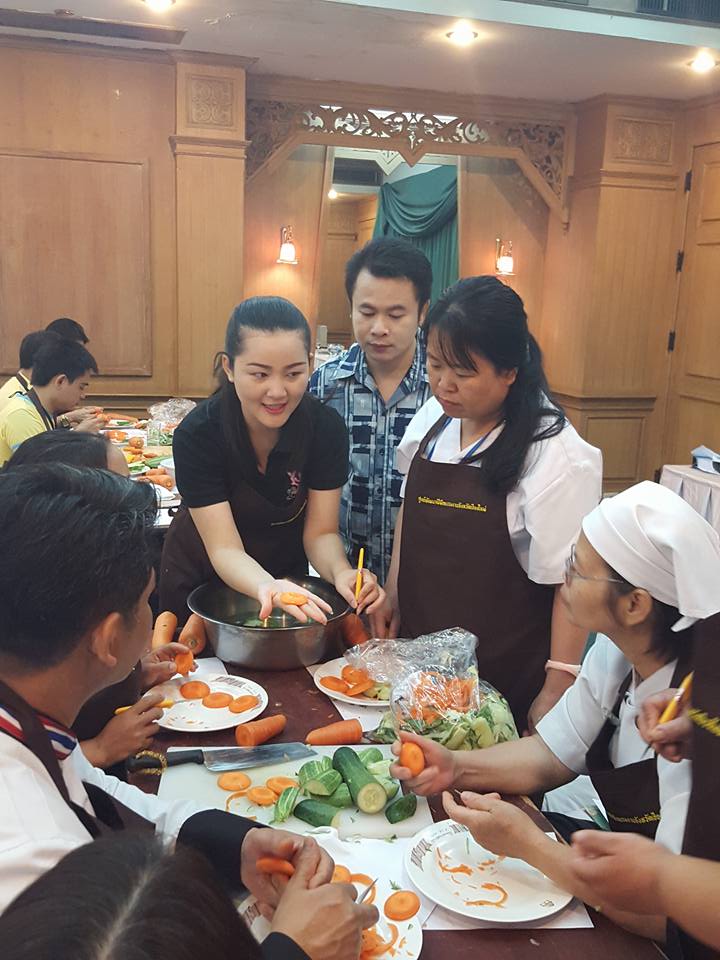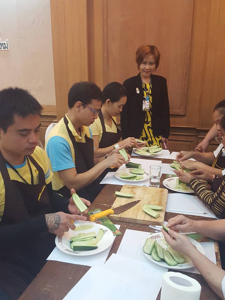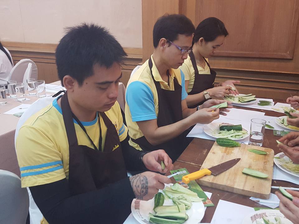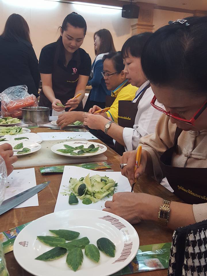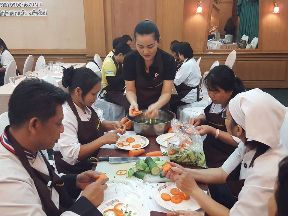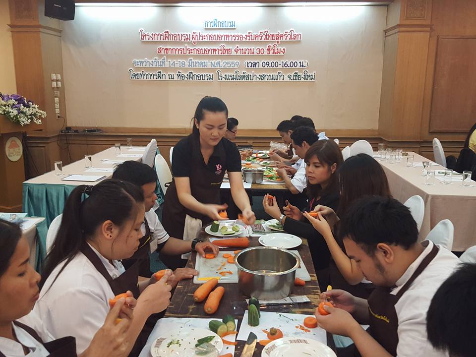 ศูนย์พัฒนาฝีมือแรงงานจังหวัดเชียงใหม่ เปิดฝึก โครงการฝึกอบรมผู้ประกอบอาหารรองรับครัวไทยสู่ครัวโลก สาขาการประกอบอาหารไทย 30 ชม. ให้กับพนักงานครัวของโรงแรมโลตัสปางสวนแก้ว จำนวน 30 คน ระหว่างวันที่ 14 - 18 มีนาคม 2559 ณ ห้องฝึกอบรม โรงแรมโลตัสปางสวนแก้ว เชียงใหม่ # วันแรก ฝึกแกะสลักผัก ขั้นพื้นฐาน #