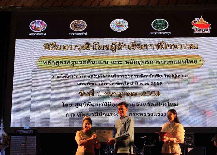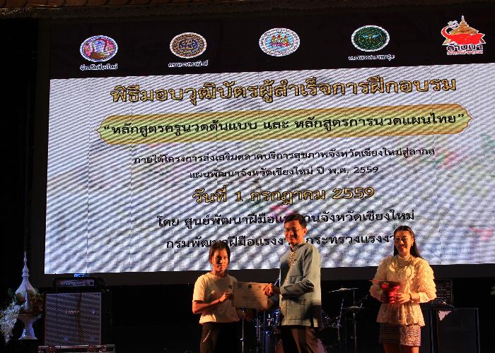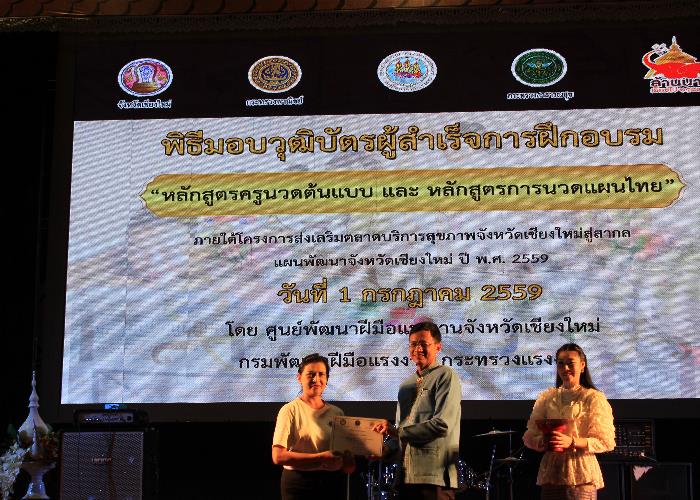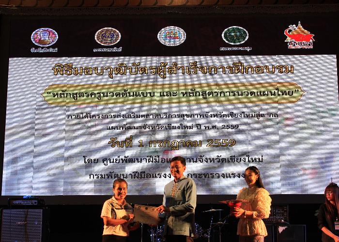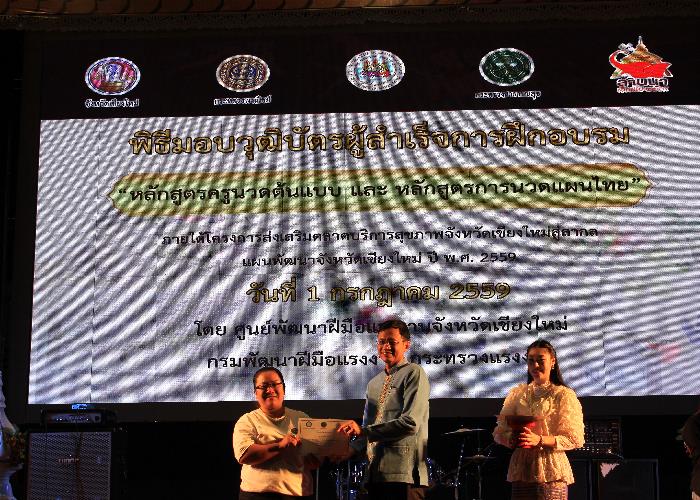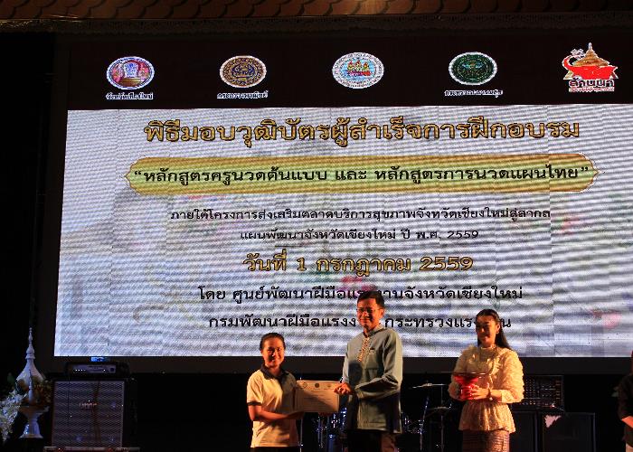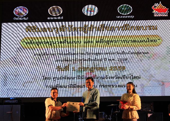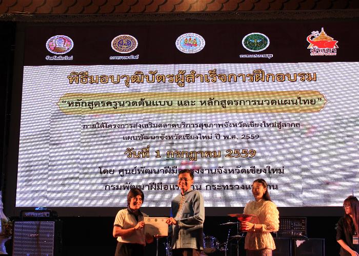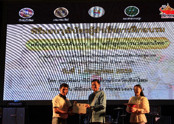 ชื่ออัลบั้ม :: ภาพการรับมอบวุฒิบัตร ผู้สำเร็จการฝึก หลักสูตรครูนวดต้นแบบ และ การนวดแผนไทย ภายใต้โครงการจังหวัดเชียงใหม่ ปี 2559