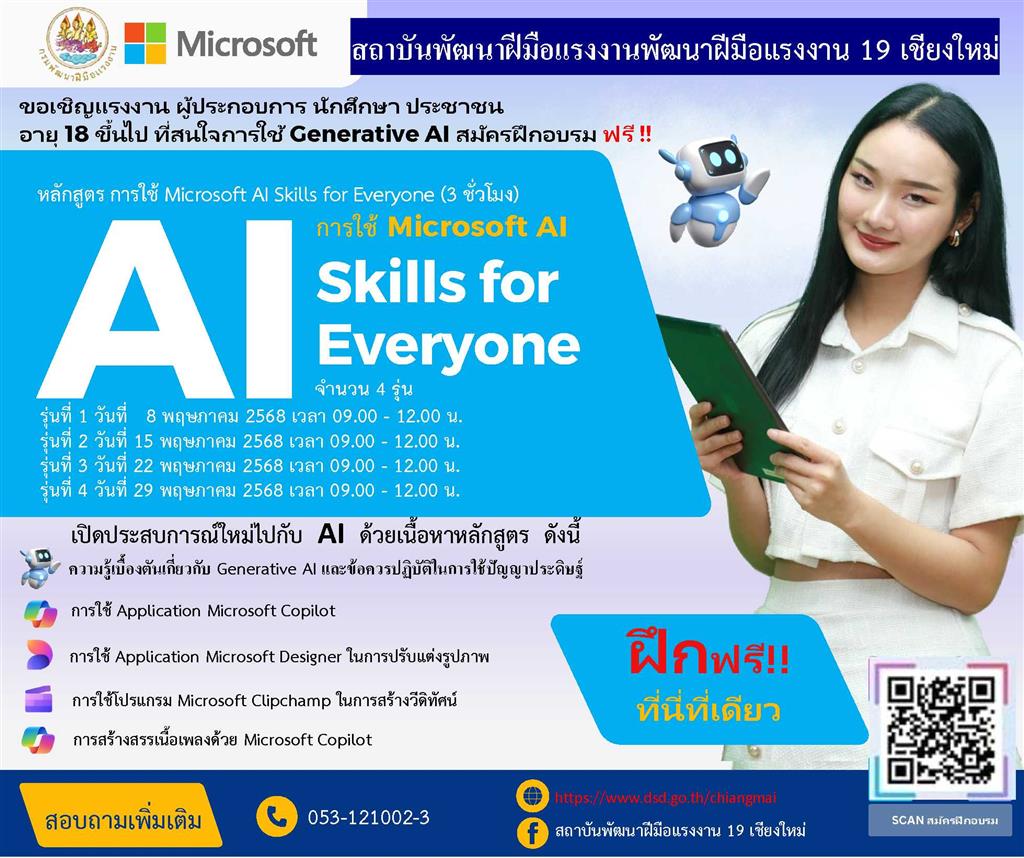 * ประชาสัมพันธ์การฝึกอบรมหลักสูตร การใช้ Microsoft AI Skill for Everyone โดย สถาบันพัฒนาฝีมือแรงงาน 19 เชียงใหม่ จำนวน 4 รุ่น ๆ ละ 3 ชั่วโมง ในวันที่ 8 ,15, 22, 29 พฤษภาคม 2568 ตามลำดับ ท่านใดสนใจและสะดวกในการฟังการฝึกอบรมตามกำหนดการดังกล่าวคลิกเข้าไปลงทะเบียนสมัครเข้าฝึกอบรมได้ที่ https://www.dsd.go.th/DSD/Intro/ListTraining?searchText=&searchActivity=&searchDepartment=50