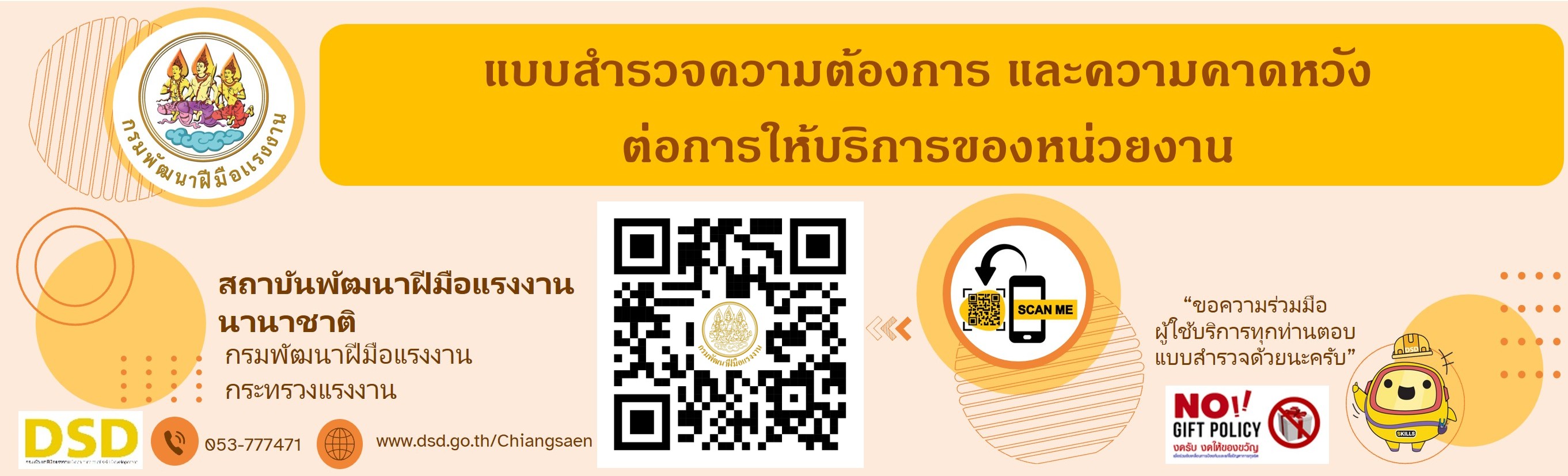 สถาบันพัฒนาฝีมือแรงงานนานาชาติ กรมพัฒนาฝีมือแรงงาน ขอความร่วมมือผู้รับบริการทุกท่านตอบแบบสำรวจความต้องการ และความคาดหวัง ต่อการให้บริการของ สถาบันพัฒนาฝีมือแรงงานนานาชาติ ทั้งนี้ เพื่อเป็นการรักษามาตรฐานการให้บริการประชาชนของหน่วยงานรัฐ และนำข้อมูลที่ได้ไปปรับปรุงพัฒนาการให้บริการของศูนย์ราชการสะดวกต่อไป สแกน QR code หรือกดตามลิงค์นี้ https://forms.gle/NFFe9m76Zygqhi4w5