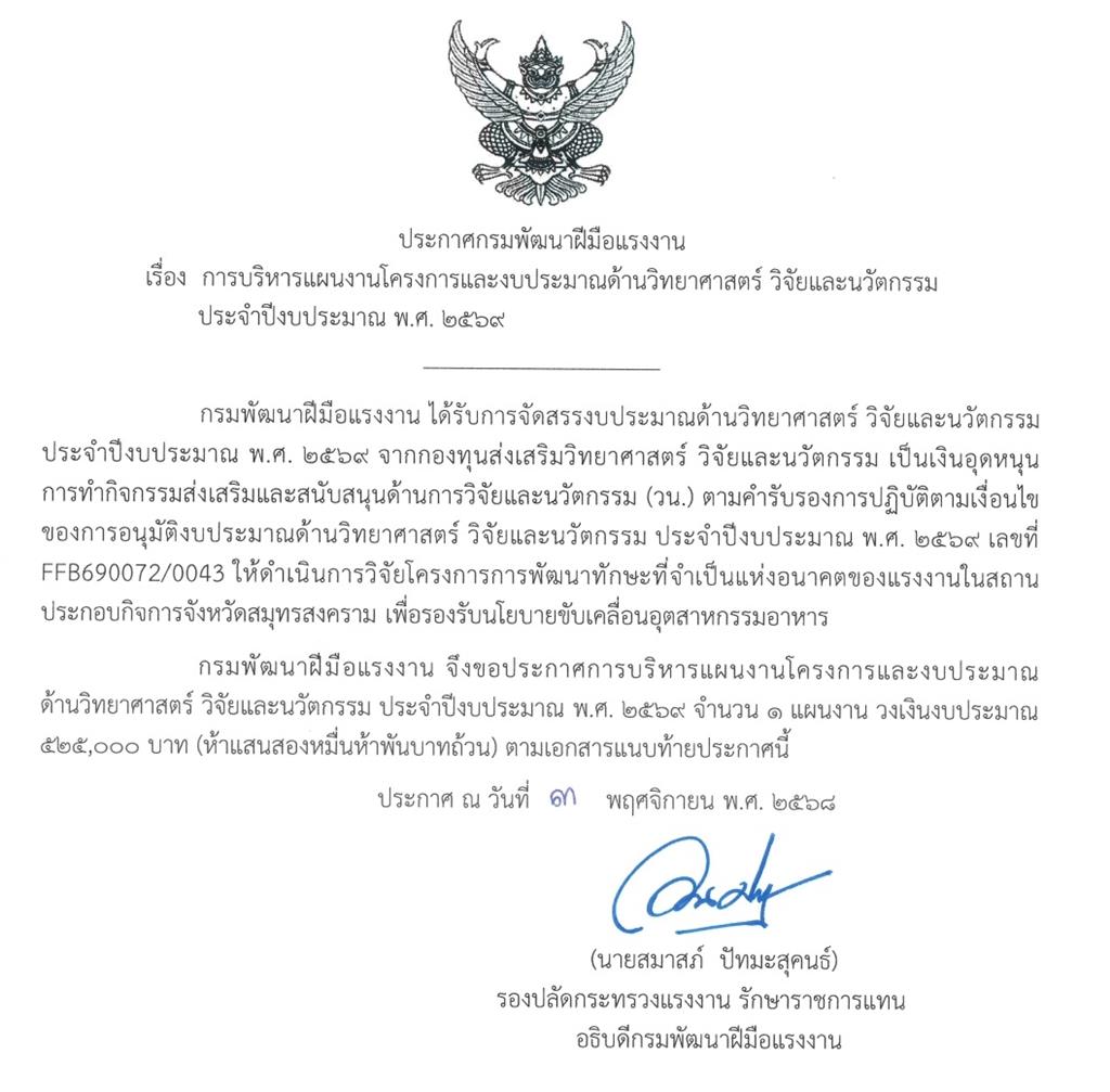 กรมพัฒนาฝีมือแรงงานได้รับการจัดสรรงบประมาณด้านวิทยาศาสตร์ วิจัย และนวัตกรรม ประจำปีงบประมาณ พ.ศ. 2569 จากกองทุนส่งเสริมวิทยาศาสตร์ วิจัยและนวัตกรรม เป็นเงินอุดหนุนการทำกิจกรรมส่งเสริมและสนับสนุนด้านการวิจัยและนวัตกรรม (วน.) ตามคำรับรองการปฏิบัติตามเงื่อนไขของการอนุมัติงบประมาณด้านวิทยาศาสตร์ วิจัย และนวัตกรรม ประจำปีงบประมาณ พ.ศ. 2569 เลขที่ FFB690072/0043 ให้ดำเนินการวิจัยโครงการการพัฒนาทักษะที่จำเป็นแห่งอนาคตของแรงงานในสถานประกอบกิจการจังหวัดสมุทรสงคราม เพื่อรองรับนโยบายขับเคลื่อนอุตสาหกรรมอาหาร