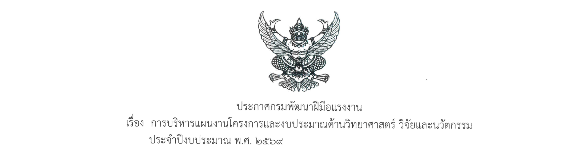 กรมพัฒนาฝีมือแรงงาน จึงขอประกาศการบริหารแผนงานโครงการและงบประมาณด้านวิทยาศาสตร์ วิจัยและนวัตกรรม ประจำปีงบประมาณ พ.ศ. 2569 จำนวน 1 แผนงาน วงเงินงบประมาณ 525,000 บาท ตาม Link Download ด้านล่างนี้