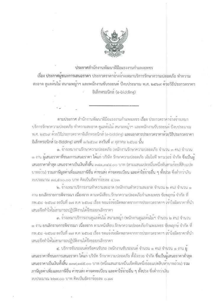 ประกาศผู้ชนะการเสนอราคา ประกวดราคาจ้างเหมาบริการรักษาความปลอดภัย ทำความสะอาด ดูแลต้นไม้สนามหญ้าฯ และพนักงานขับรถยนต์ ปีงบประมาณ พ.ศ. 2569 ด้วยวิธีประกวดราคาอิเล็กทรอนิกส์(e-bidding