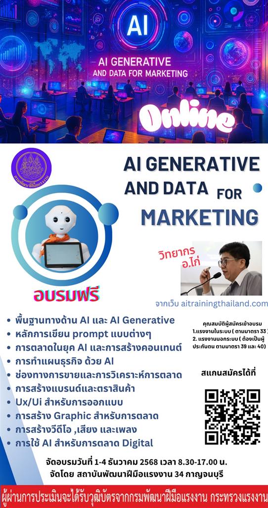 ขอเชิญผู้สนใจเข้าร่วมอบรมหลักสูตร AI Generative and Data for Marketing เพื่อพัฒนาทักษะด้านเทคโนโลยีและการตลาดยุคดิจิทัล
