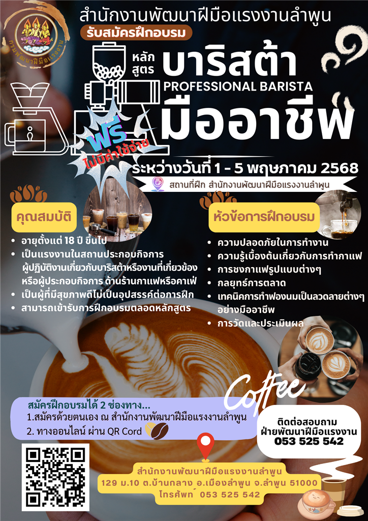 สำนักงานพัฒนาฝีมือแรงงานลำพูน เปิดรับสมัครฝึกอบรม หลักสูตร บาริสต้ามืออาชีพ (30 ชั่วโมง) ฝึกอบรมระหว่างวันที่ 1 – 5 พฤษภาคม 2568 ณ สำนักงานพัฒนาฝีมือแรงงานลำพูน โดยคุณสมบัติผู้สมัครฝึกอบรม มีรายละเอียดดังนี้ 1. อายุตั้งแต่ 18 ปี ขึ้นไป 2. เป็นแรงงานในสถานประกอบกิจการผู้ปฏิบัติงานเกี่ยวกับบาริสต้าหรืองานที่เกี่ยวข้อง หรือผู้ประกอบกิจการ ด้านร้านกาแฟหรือคาเฟ่ 3. เป็นผู้ที่มีสุขภาพดีไม่เป็นอุปสรรค์ต่อการฝึก 4. สามารถเข้ารับการฝึกอบรมตลอดหลักสูตร อบรมฟรีไม่มีค่าใช้จ่าย รับจำนวนจำกัดเพียง 20 ท่านเท่านั้น