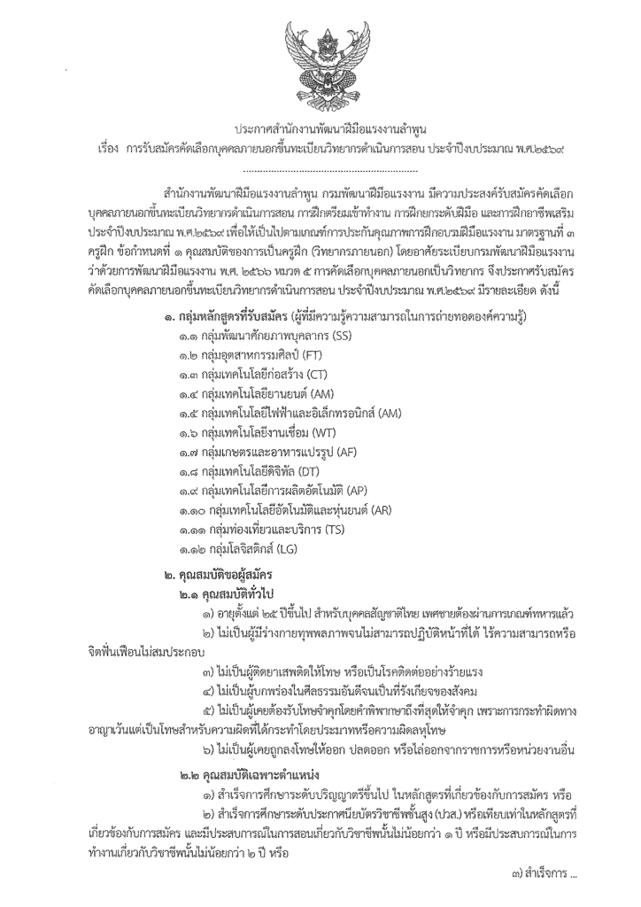 สำนักงานพัฒนาฝีมือแรงงานลำพูน สร้างเครือข่าย วิทยากรที่มีความรู้ความสามารถเฉพาะด้าน สร้างองค์ความรู้ที่สร้างประโยชน์กับประชาชน ที่ตรงตามความต้องการของผู้ใช้บริการอย่างแท้จริง และทำให้การดำเนินงานเป็นไปอย่างมีประสิทธิภาพ และมีประสิทธิผล เพื่อตอบสนองความต้องการของผู้รับบริการและผู้มีส่วนได้ส่วนเสียอย่างครอบคลุม ทุกกลุ่มเป้าหมาย และอุตสาหกรรมที่เป็นนโยบายของพื้นที่อย่างชัดเจน จึงประกาศรับสมัครคัดเลือกบุคคลภายนอกขึ้นทะเบียนวิทยากรดำเนินการสอน ประจำปีงบประมาณ พ.ศ. 2569 ในหลักสูตร 1. กลุ่มพัฒนาศักยภาพบุคลากร (SS) 2. กลุ่มอุตสาหกรรมศิลป์ (FT) 3. กลุ่มเทคโนโลยีก่อสร้าง (CT) 4. กลุ่มเทคโนโลยียานยนต์ (AM) 5. กลุ่มเทคโนโลยีไฟฟ้าและอิเล็กทรอนิกส์ (AM) 6. กลุ่มเทคโนโลยีงานเชื่อม (WT) 7. กลุ่มเกษตรและอาหารแปรรูป (AF) 8. กลุ่มเทคโนโลยีดิจิทัล (DT) 9. กลุ่มเทคโนโลยีการผลิตอัตโนมัติ (AP) 10. กลุ่มเทคโนโลยีอัตโนมัติและหุ่นยนต์ (AR) 11. กลุ่มท่องเที่ยวและบริการ (TS) 12. กลุ่มโลจิสติกส์ (LG)