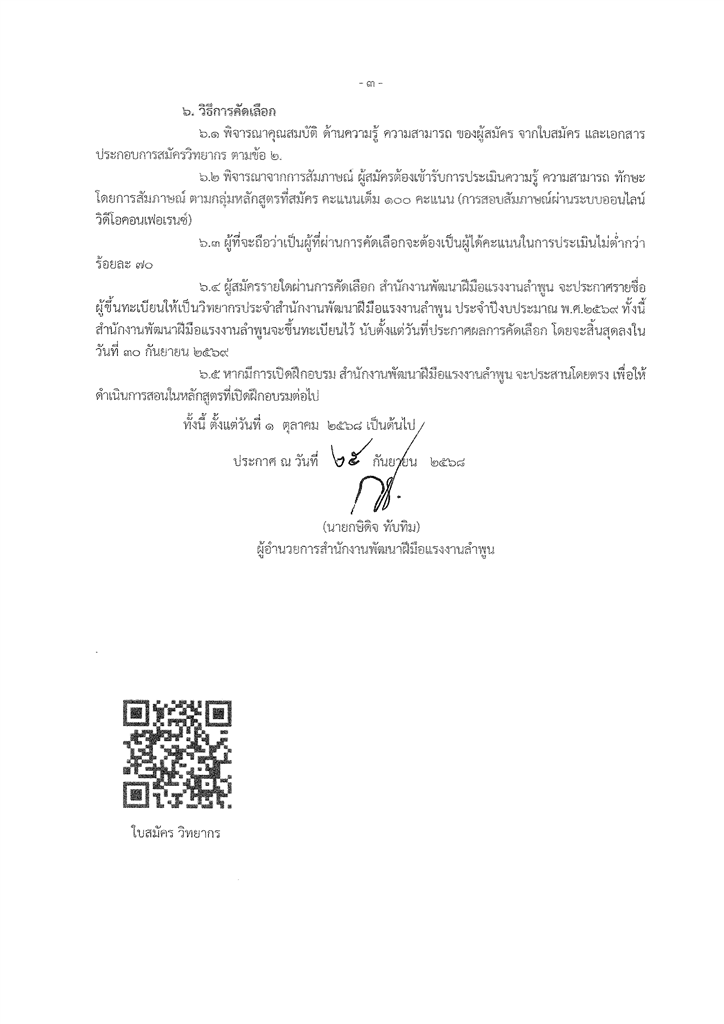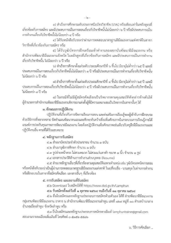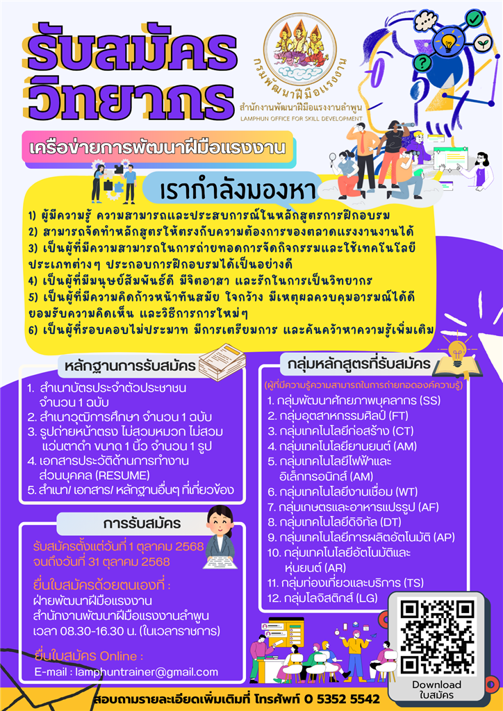 หากท่านเป็นคนหนึ่งที่สนใจเป็นวิทยากรอบรม หรือเป็นวิทยากรอยู่แล้ว สามารถ Download ใบสมัครได้ที่ https://www.dsd.go.th/Lamphun และยื่นใบสมัครและหลักฐานประกอบการสมัคร ด้วยตัวเอง ณ สำนักงานพัฒนาฝีมือแรงงานลำพูน รับสมัครตั้งแต่วันที่ 1 ตุลาคม 2568 จนถึงวันที่ 31 ตุลาคม 2568 สอบถามรายละเอียดเพิ่มเติมที่ โทรศัพท์ 0 5352 5542