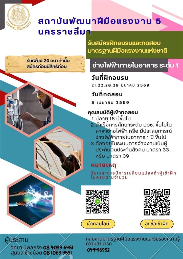 รับสมัครฝึกอบรมและทดสอบมาตรฐานฝีมือแรงงานแห่งชาติ สาขาช่างไฟฟ้าภายในอาคาร ระดับ 1