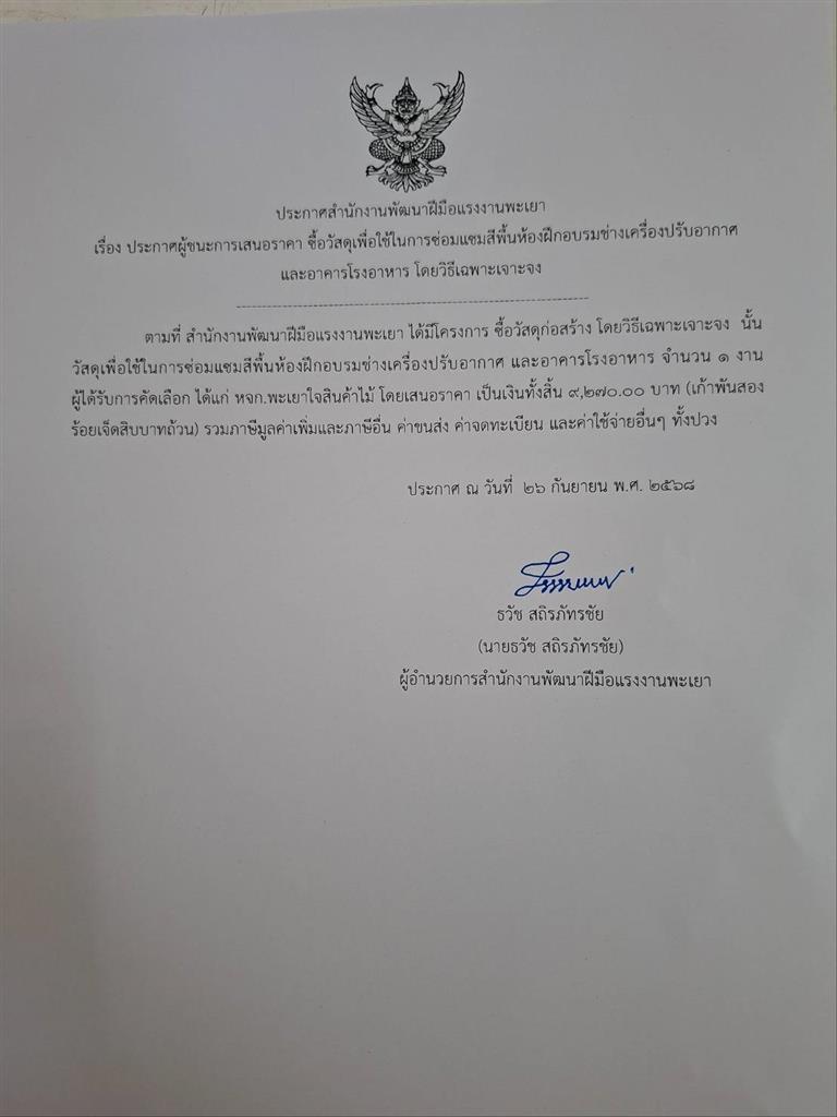 ตามที่สำนักงานพัฒนาฝีมือแรงงานพะเยา ได้มีโครงการซื้อวัสดุก่อสร้าง โดยวิธีเจาะจง นั้น เพื่อใช้ในการซ่อมแซมสีพื้นห้องฝึกอบรมช่างเครื่องปรับอากาศ และอาคารโรงอาหาร จำนวน 1 งาน ผู้ได้รับเลือกได้แก่ หจก.พะเยาใจสินค้าไม้ โดยเสนอราคาเป็นเงินทั้งสิ้น 9,270.00 บาท (เก้าพันสองร้อยเจ็ดสิบบาทถ้วน) รวมภาษีมูลค่าเพิ่ม และภาษีอื่น ค่าขนส่ง ค่าจดทะเบียน และค่าใช้จ่ายอื่น ๆ ทั้งปวง
