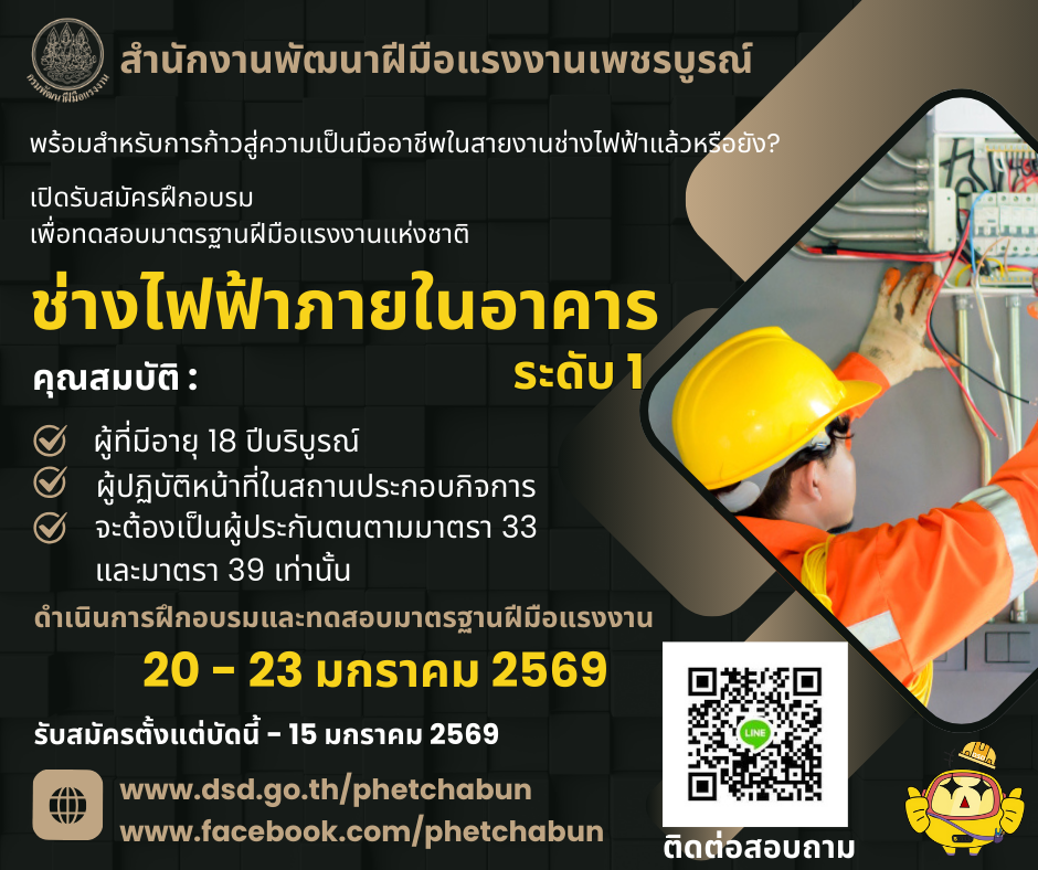 รับสมัครฝึกอบรมเพื่อทดสอบมาตรฐานฝีมือแรงงานแห่งชาติ สาขาช่างไฟฟ้าภายในอาคาร ระดับ 1