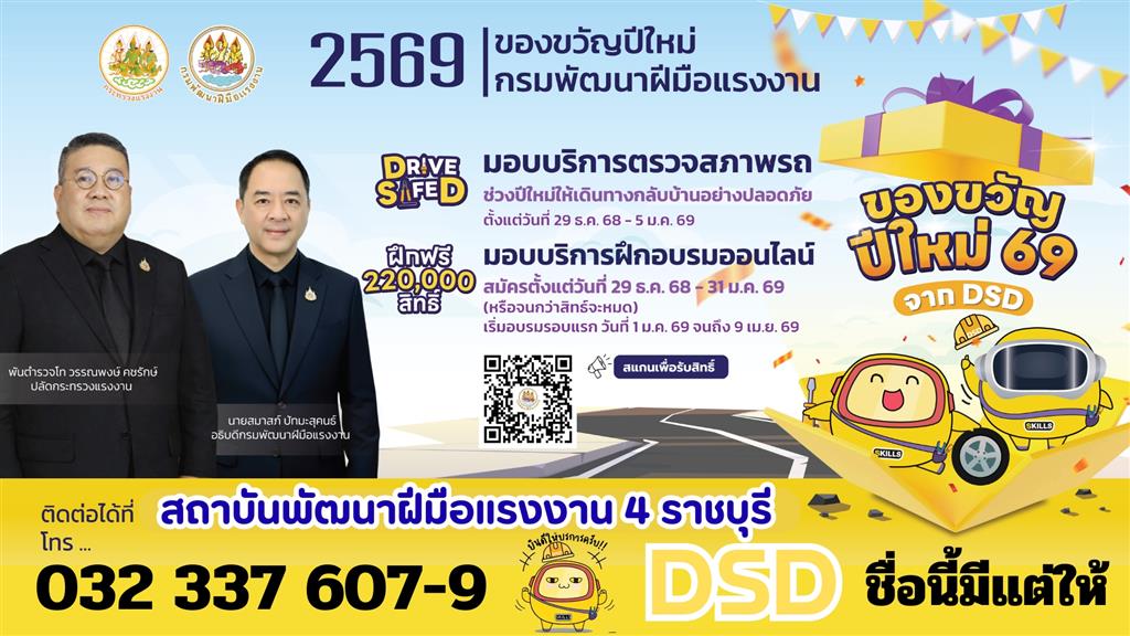 ของขวัญปีใหม่ 2569 จากกรมพัฒนาฝีมือแรงงาน สถาบันพัฒนาฝีมือแรงงาน 4 ราชบุรี มอบความห่วงใยให้ประชาชนตลอดช่วงเทศกาลปีใหม่ บริการตรวจสภาพรถ Drive Safe D ช่วยให้เดินทางกลับบ้านอย่างปลอดภัย อุ่นใจทุกเส้นทาง ตั้งแต่วันที่ 29 ธันวาคม 2568 – 5 มกราคม 2569 พิเศษ มอบบริการฝึกอบรมออนไลน์ ฝึกฟรีกว่า 220,000 สิทธิ์
