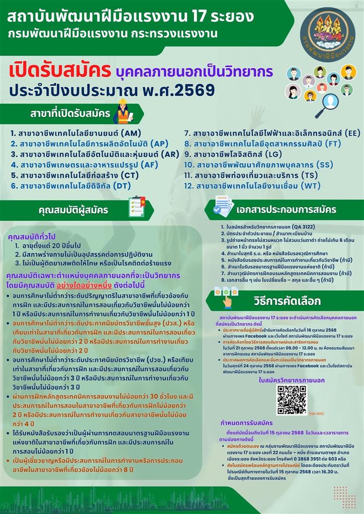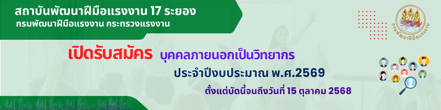 สถาบันพัฒนาฝีมือแรงงาน 17 ระยอง เปิดรับสมัครบุคคลภายนอก เป็นวิทยากรประจำปีงบประมาณ พ.ศ.2569