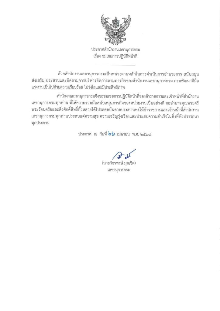 ประกาศสำนักงานเลขานุการกรม  เรื่อง ชมเชยการปฏิบัติหน้าที่
