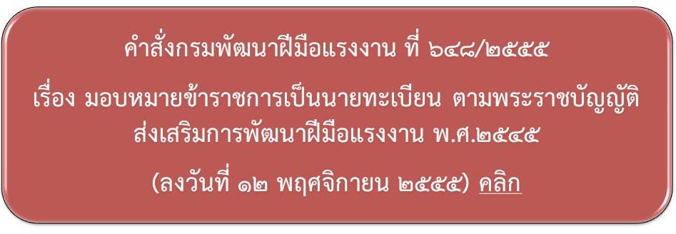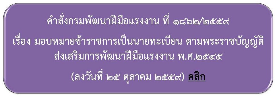 คำสั่งกรมพัฒนาฝีมือแรงงาน ที่ 2122/2559 เรื่อง มอบหมายข้าราชการเป็นนายทะเบียนตามพระราชบัญญัติ ส่งเสริมการพัฒนาฝีมือแรงงาน พ.ศ.2545 ลว 2 ธันวาคม 2559 ( ภูมิภาค) คลิก