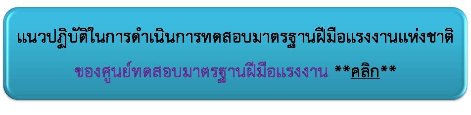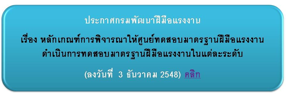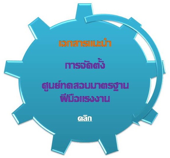 ศูนย์ทดสอบมาตรฐานฝีมือแรงงาน(ผู้ดำเนินการทดสอบมาตรฐานฝีมือแรงงานแห่งชาติ)**กฎหมายที่เกี่ยวข้อง**พระราชบัญญัติส่งเสริมการพัฒนาฝีมือแรงงาน พ.ศ.2545 และที่แก้ไขเพิ่มเติม คลิก
