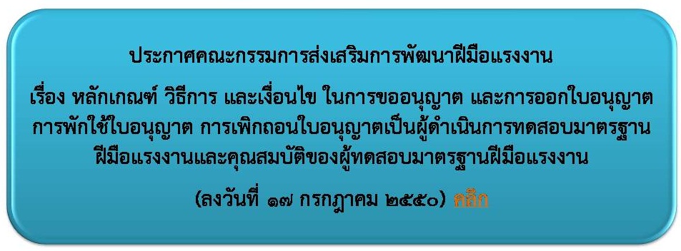 - เรื่อง กำหนดอัตราค่าทดสอบมาตรฐานฝีมือแรงงาน ลงวันที่ 20 พฤศจิกายน 2550 คลิก