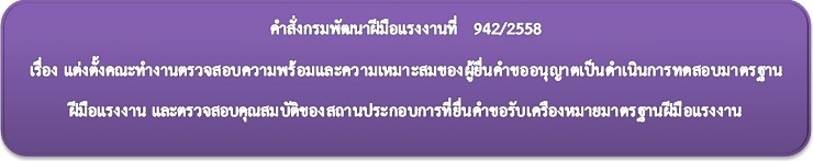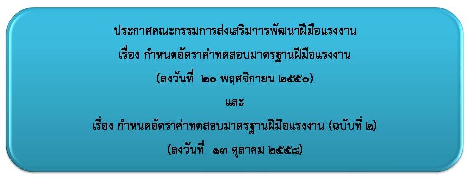 - เรื่อง กำหนดอัตราค่าทดสอบมาตรฐานฝีมือแรงงาน (ฉบับที่ 2) ลงวันที่ 13 ตุลาคม 2558 คลิก