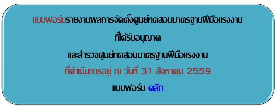 แบบฟอร์มรายงานผลการจัดตั้งศูนย์ทดสอบมาตรฐานฝีมือแรงงานที่ได้รับอนุญาตและสำรวจศูนย์ทดสอบมาตรฐานฝีมือแรงงาน ที่ดำเนินการอยู่ณ วันที่ 31 สิงหาคม 2559คลิก แบบฟอร์ม