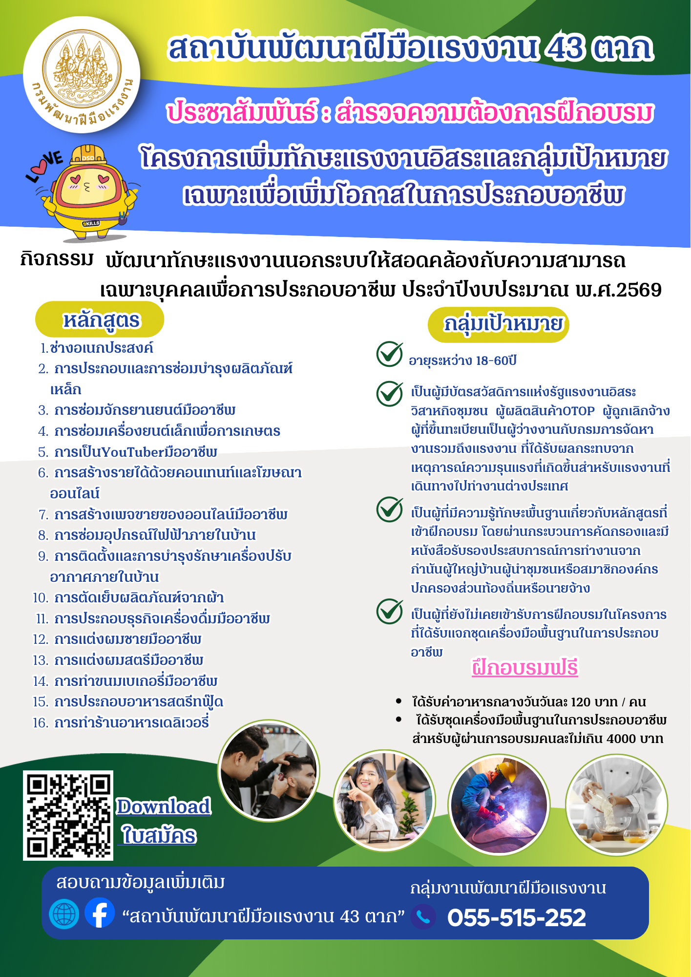 สอบถามรายละเอียดเพิ่มเติมได้ที่ กลุ่มงานพัฒนาฝีมือแรงงาน 055 515 252 ค่ะ