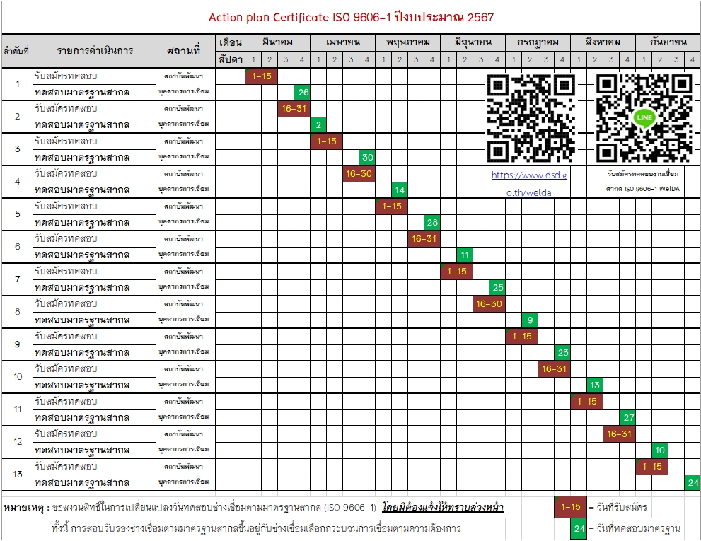 หมายเหตุ : ขอสงวนสิทธิ์ในการเปลี่ยนแปลงวันทดสอบช่างเชื่อมตามมาตรฐานสากล (ISO 9606-1) โดยมิต้องแจ้งให้ทราบล่วงหน้า ทั้งนี้การสอบรับรองช่างเชื่อมตามมาตรฐานสากลขึ้นอยู่กับช่างเชื่อมเลือกกระบวนการเชื่อมตามความต้องการ
